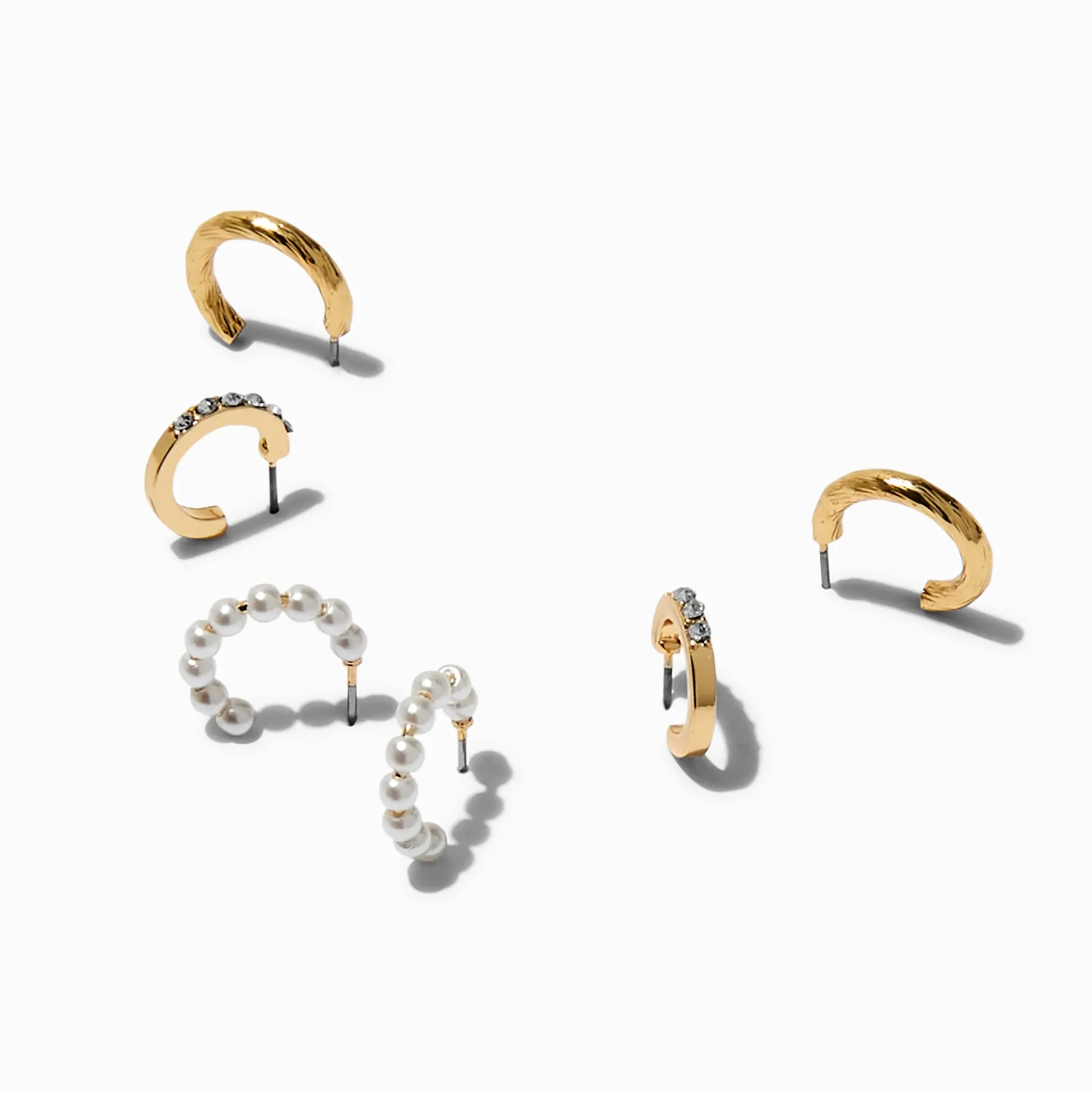 Create an earring stack with this perfectly stackable set. The three-pack includes textured hoops, faux crystal embellished hoops, and faux pearl hoops.