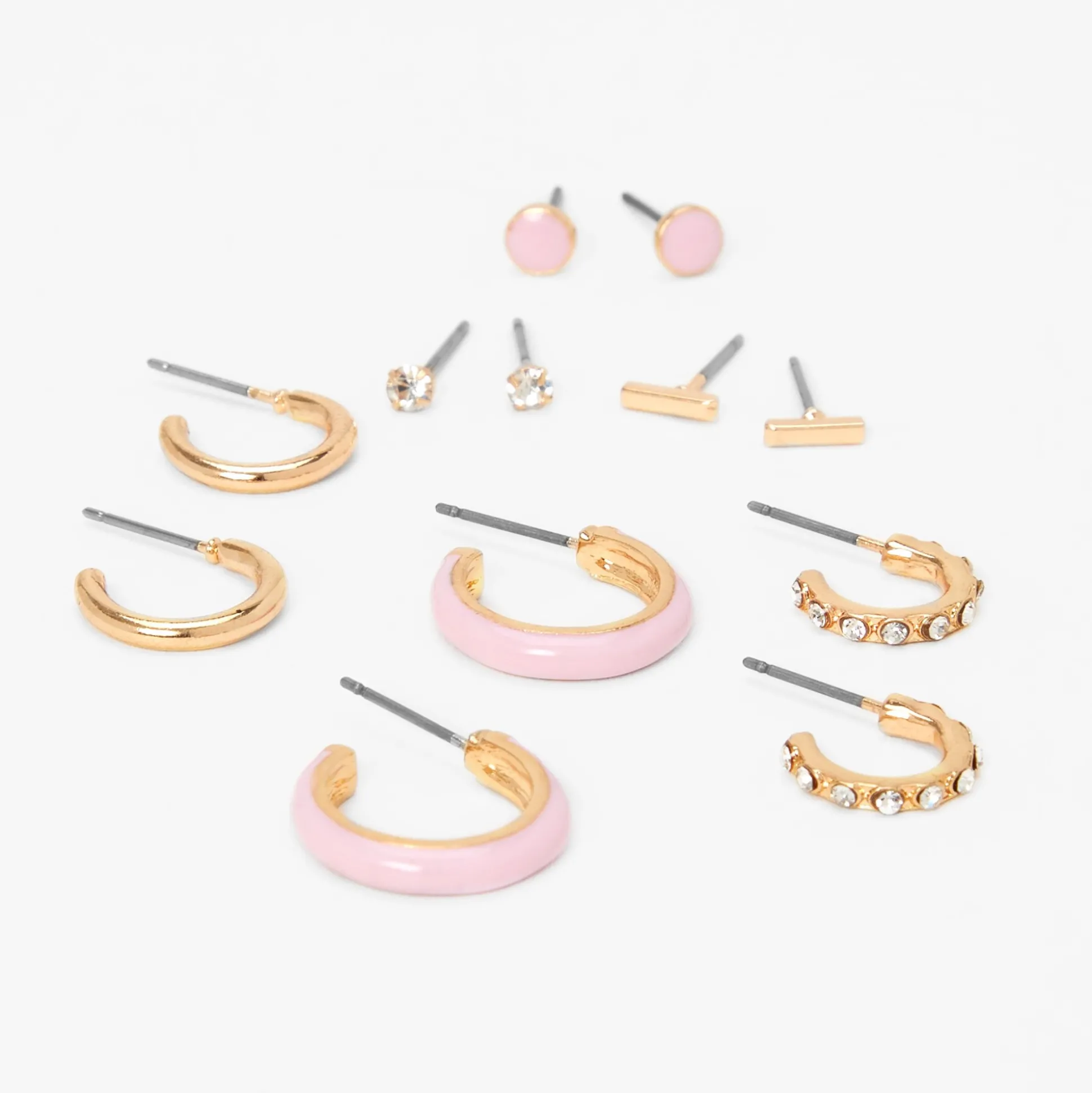 Variety is the spice of life and you’re sure to love this collection of hoop and stud earrings in pink, gold-tone, and faux crystal embellished styles. With six designs to choose from, you’ll always have the perfect pair for any outfit.