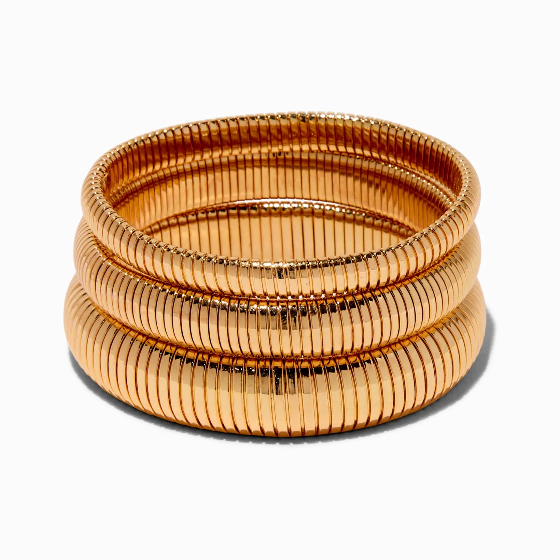 Stack up on style with this three-pack bracelet set. The gold-tone set includes three ribbed bangles in graduating sizes.