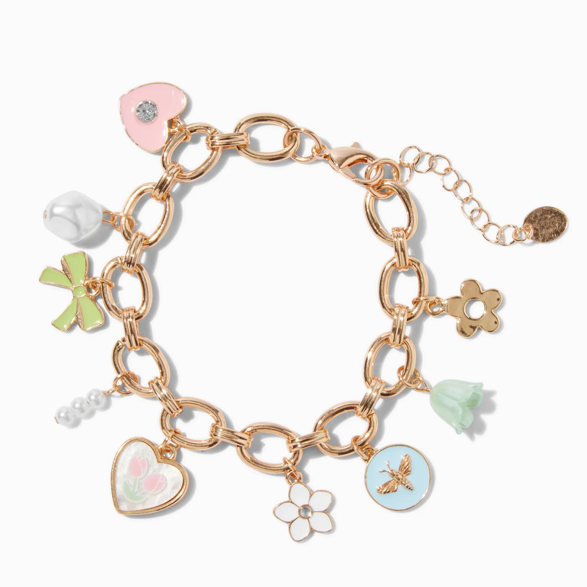 Welcome spring by upgrading your wrist with this trendy charm bracelet. The gold-tone bracelet is covered in enamel charms like flowers, bees, hearts, and more.