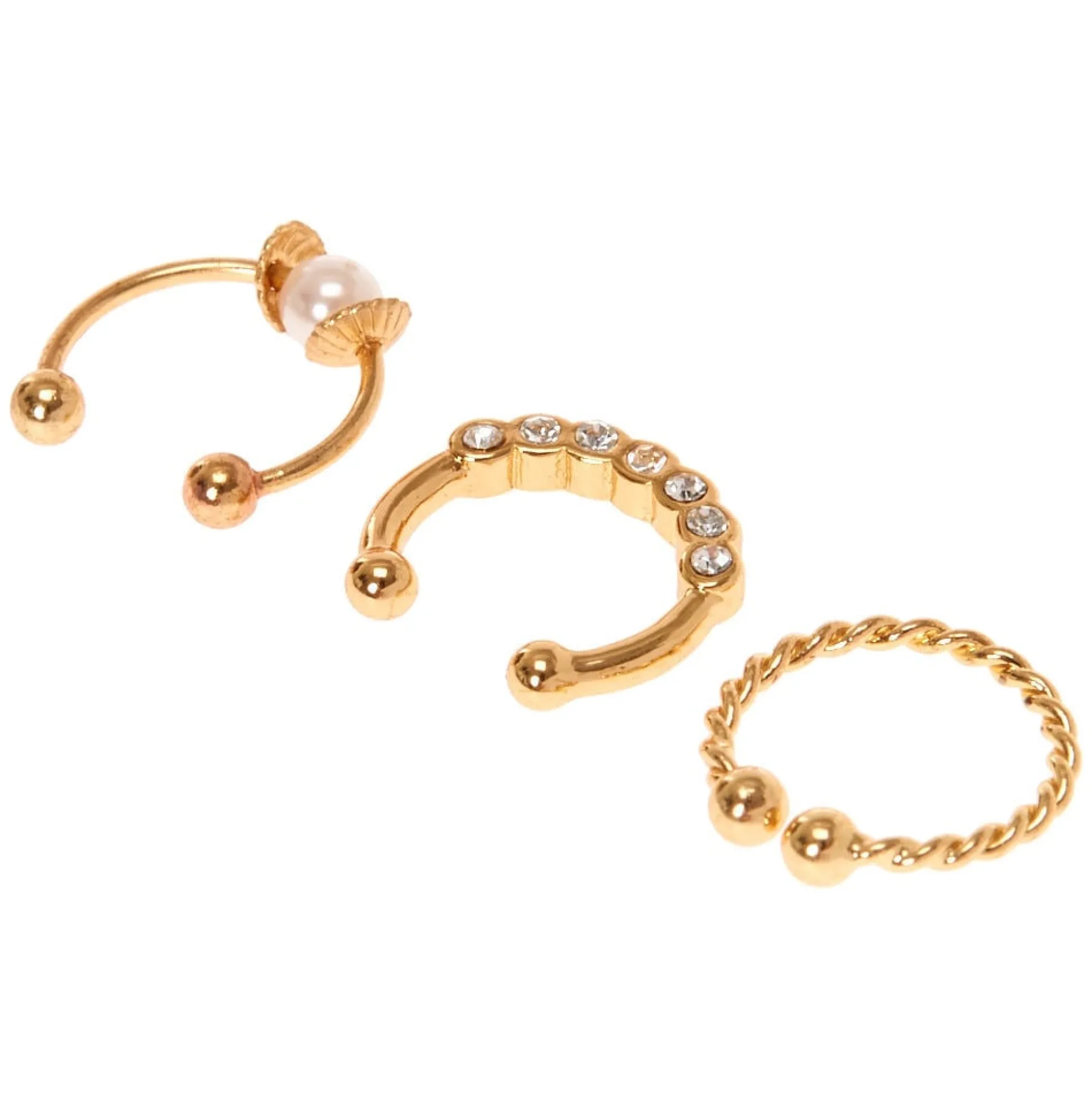 Rock alternative ear jewelry without the commitment of a piercing. This three pack of faux cartilage earrings feature pearl beads, braided metal, and crystal embellishment for a sleek, golden touch.