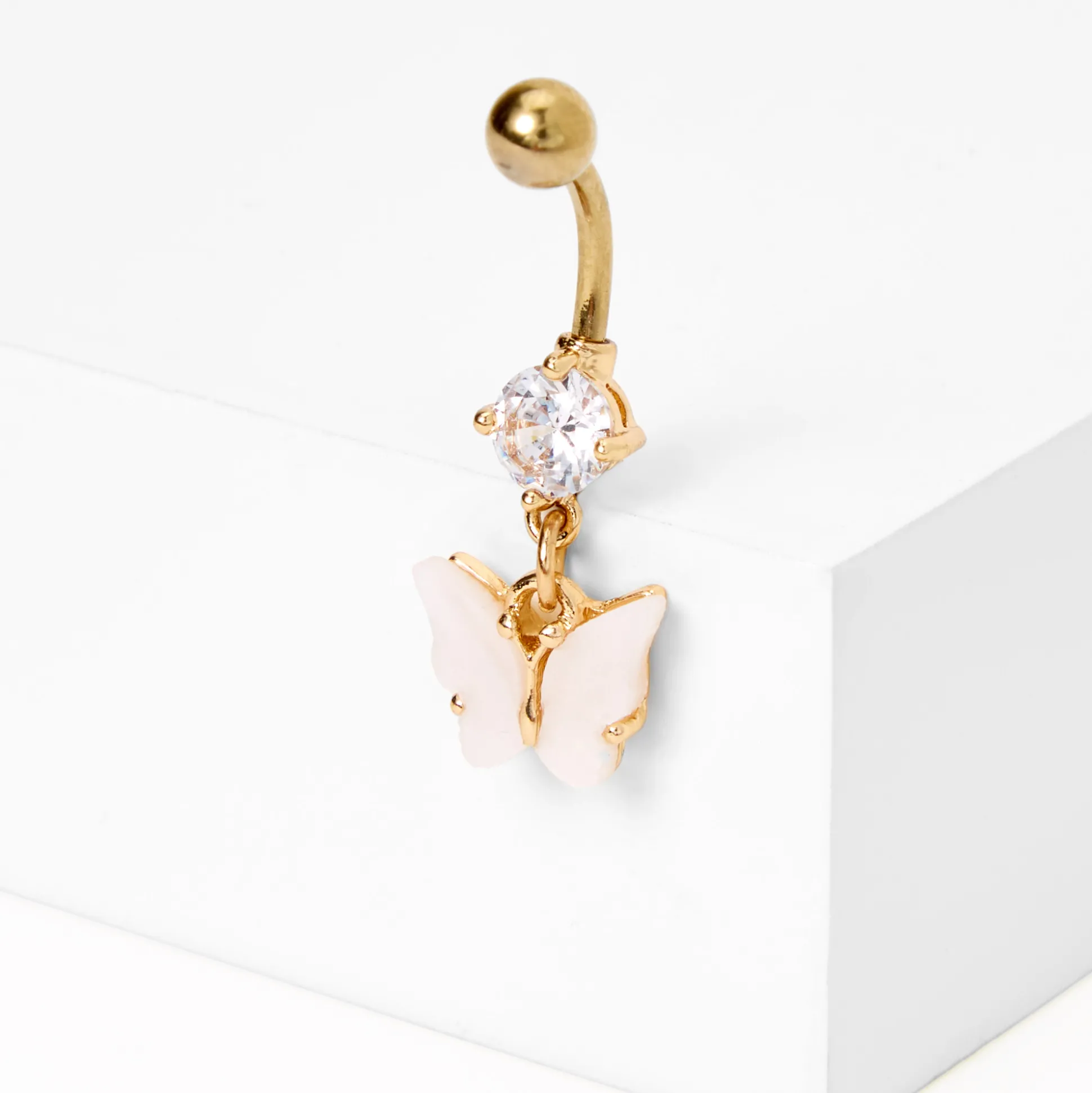 Show off your love for butterflies with this belly ring! This gold-tone bar features a dangly pink butterfly with a sparkly cubic zirconia.