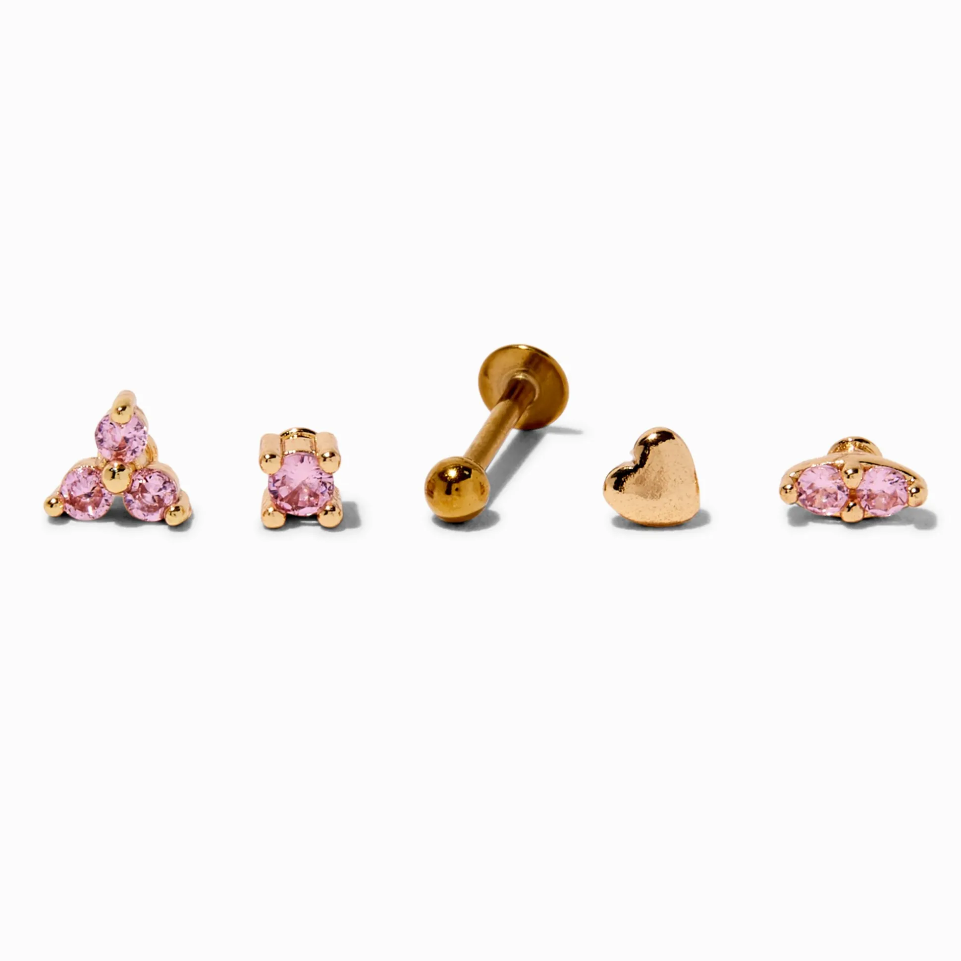 Update your cartilage piercing with this stainless steel set. This pack includes five different changeable tops to create a variety of looks. Tops include pink cubic zirconia details.