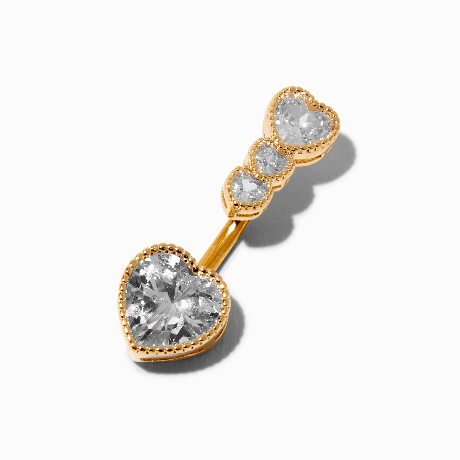 Give your everyday look a touch of love with this sparkly belly bar. The gold-toned stainless steel bar is decorated with heart-shaped cubic zirconias.