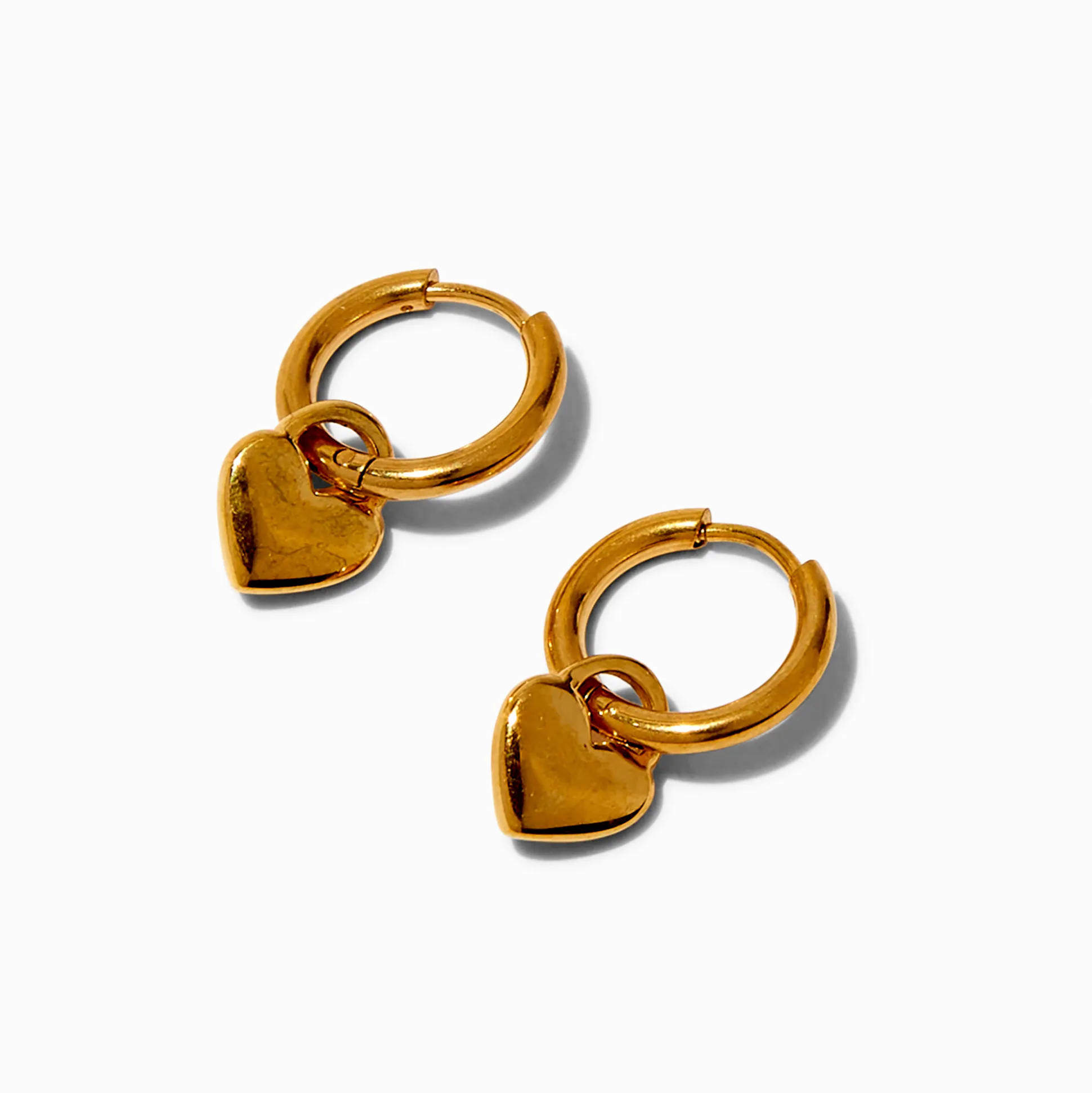 Made of durable stainless steel, these hoop earrings are perfect for everyday wear. The gold-tone designs have a dangling heart charm.