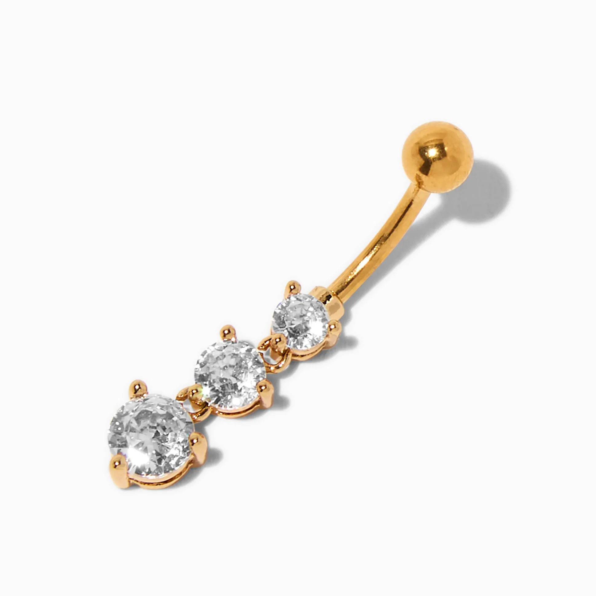 Graduated gold color crystals accent this gold barbell style ring. Designed specifically for belly button ring piercings.