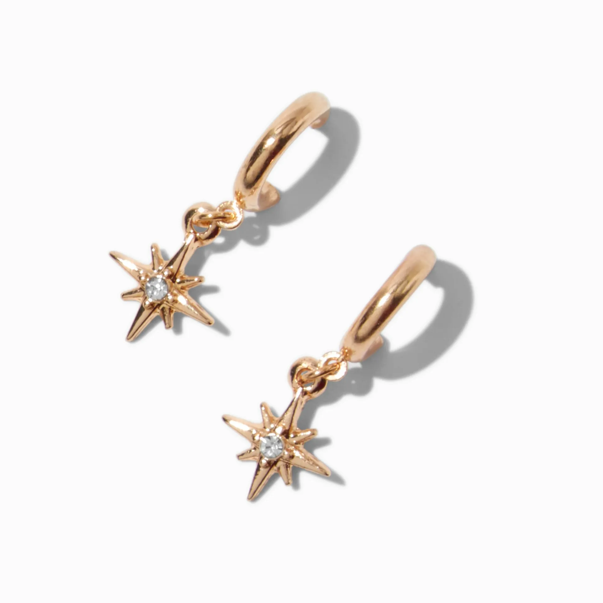 You’re the star in these gold-tone hoop earrings. The post-back design have dangling star bursts covered in faux crystals.
