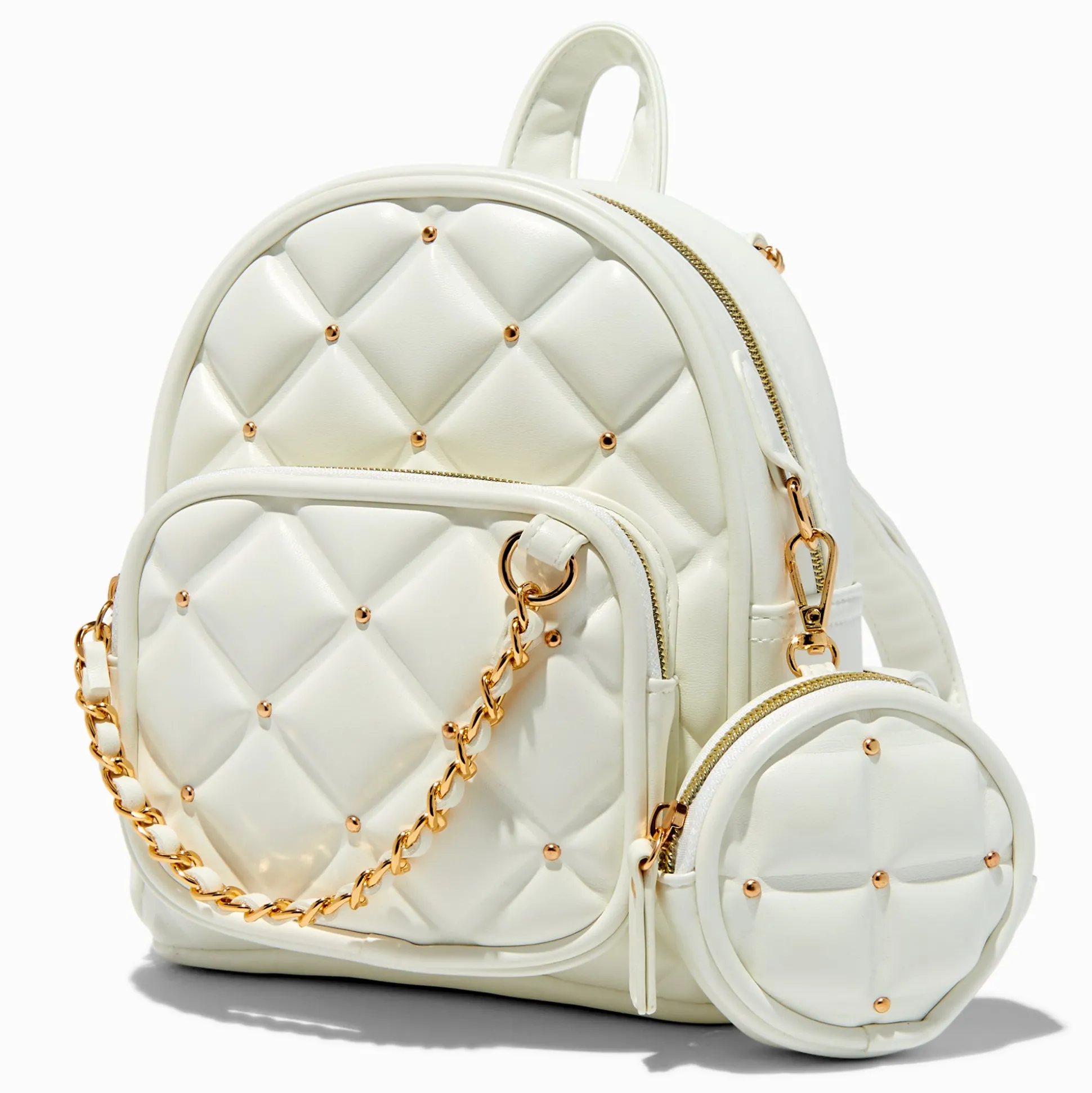 Small in size but big on style, this petite backpack is decorated all over with a quilted design and little gold-tone studs! The chunky gold-tone chain detail on front adds even more wow! Inside the main compartment and the front pocket, there’s just enough room for a few essentials, like your phone, wallet, and keys. The shoulder straps are adjustable, and it comes with a matching round coin purse that clips right on.