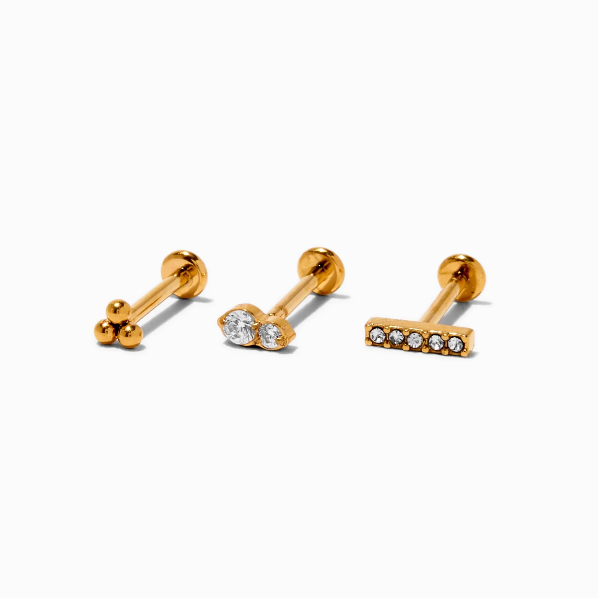Always have the perfect cartilage earring with this three-pack set. Options include a cubic zirconia cluster, a tri-ball, and a cubic zirconia bar. With a threadless-style closure, this nose stud’s decorative front and flatback post snap together, so no twisting or turning is needed like a traditional closure.