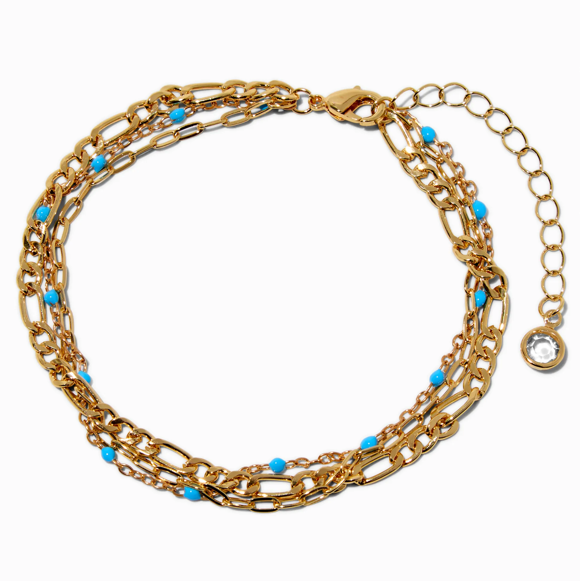Your summer look isn’t complete until you’re wearing a super cute anklet! This multi-strand, layered design is dotted with faux turquoise beads.