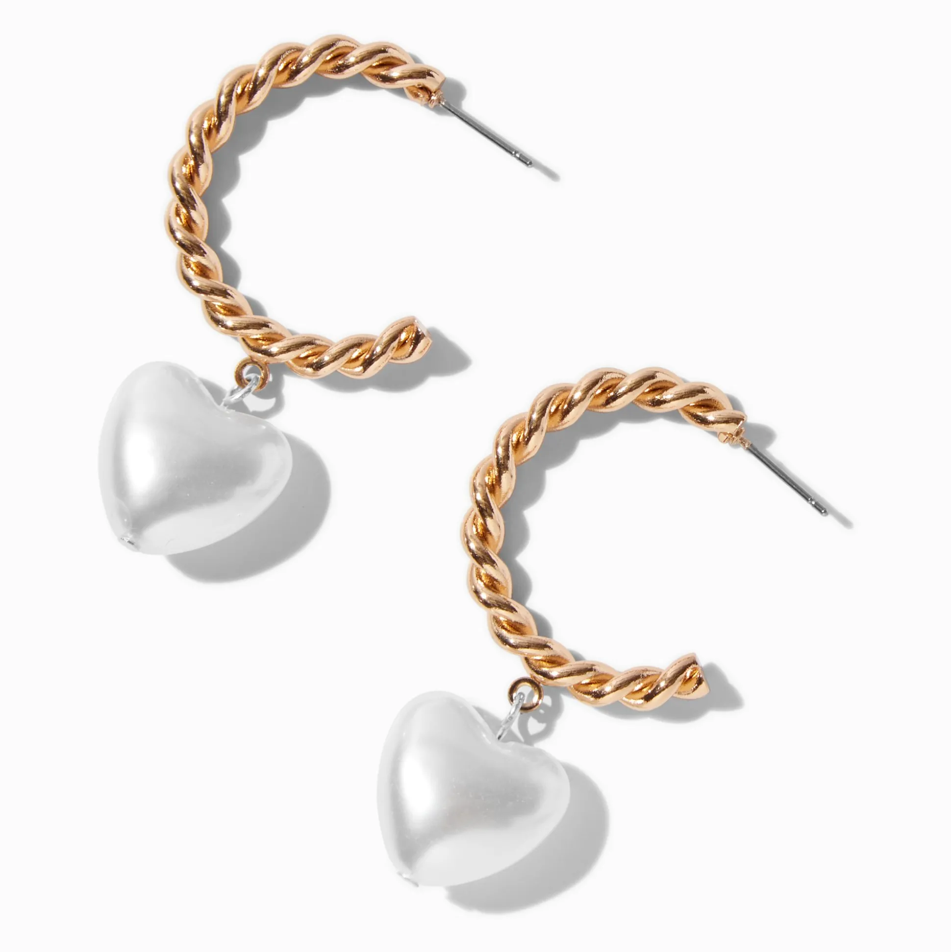These gold-tone twisted hoops add coquette style to your everyday look. These hoops are finished with heart-shaped faux pearls.