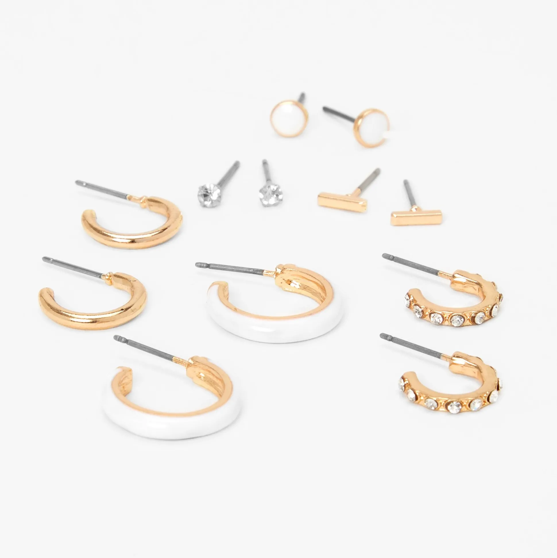 Variety is the spice of life and you’re sure to love this collection of hoop and stud earrings in white, gold-tone, and faux crystal embellished styles. With six designs to choose from, you’ll always have the perfect pair for any outfit.