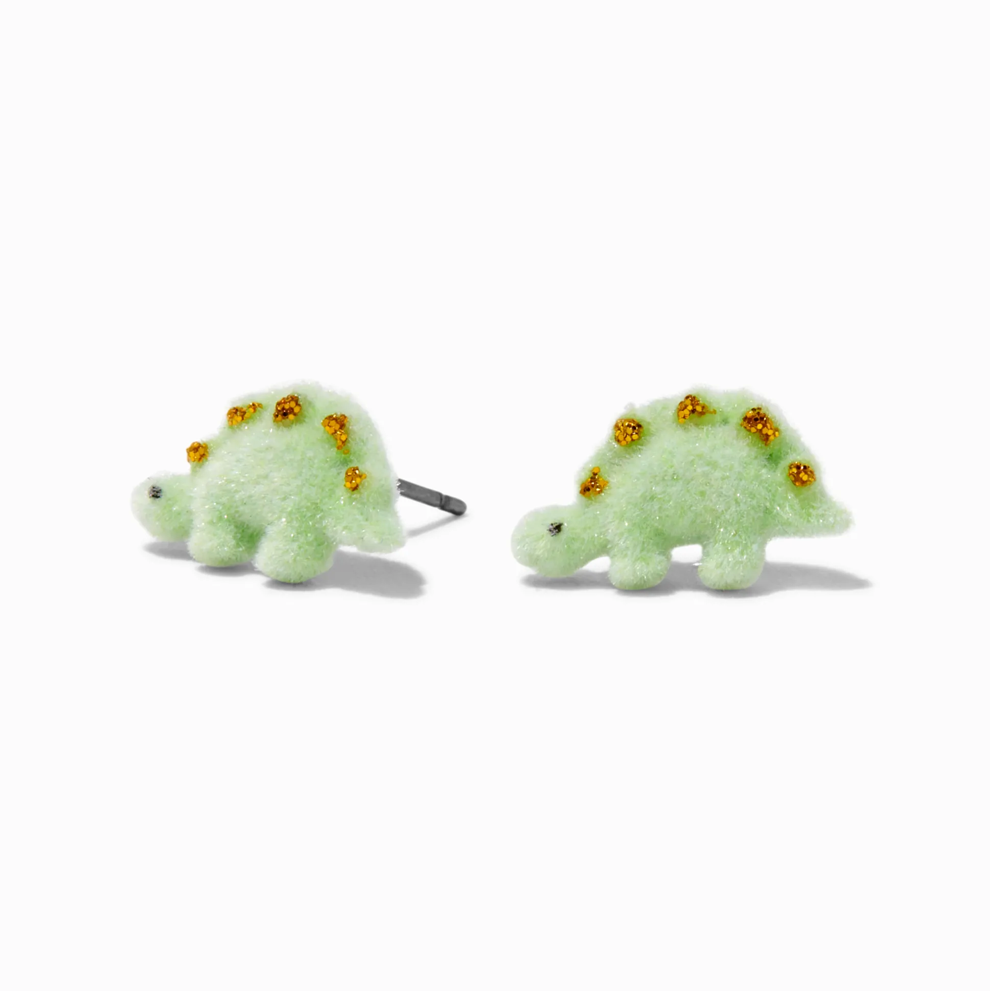 Cute, fuzzy, and prehistoric! These green dinosaur stud earrings feature glittery accents and a unique flocked texture for an added dose of fun!
