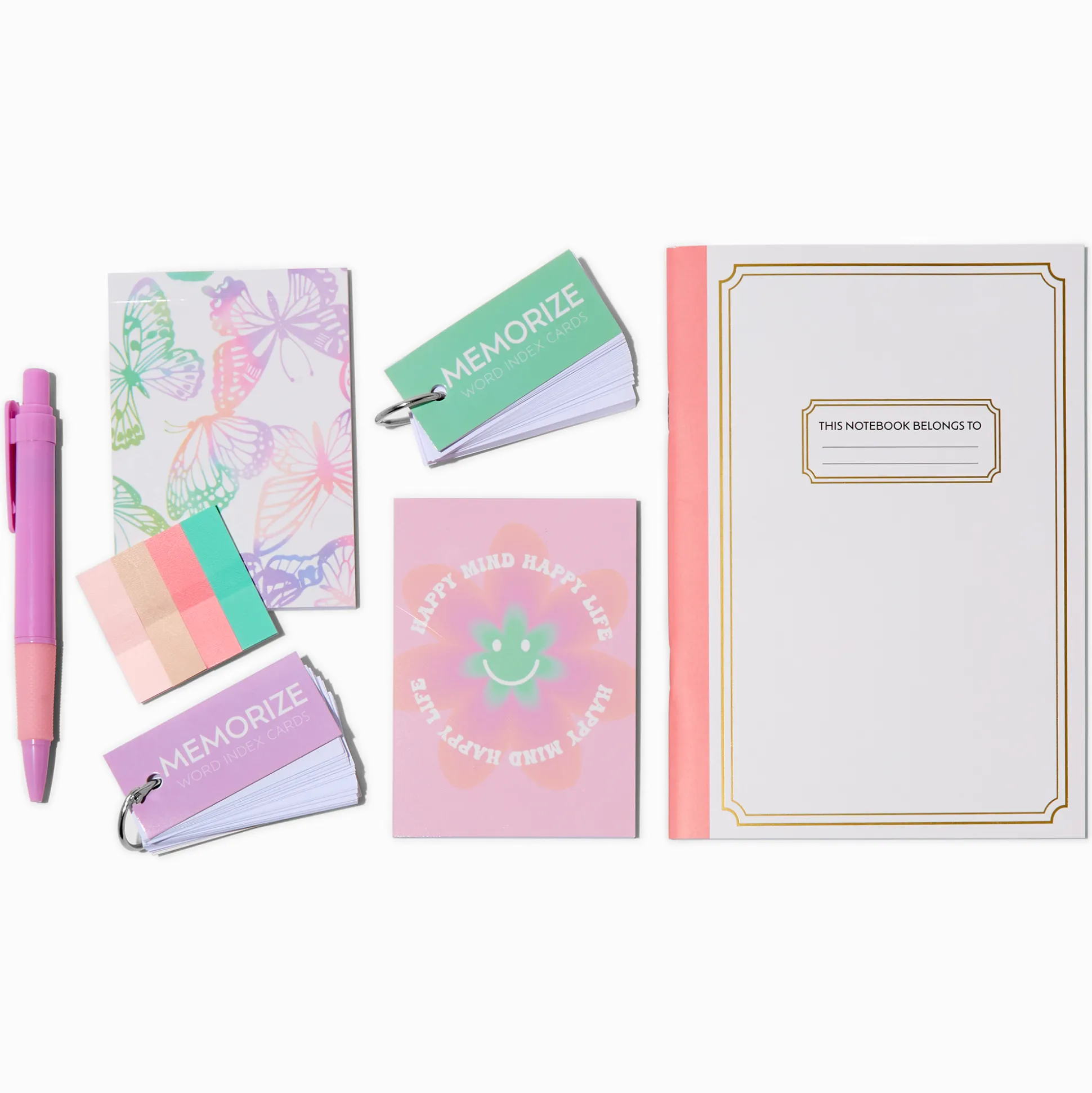 - Included: 1 pen, 1 set of sticky tabs, 2 flash card keyrings, 2 notepads, 1 notebook