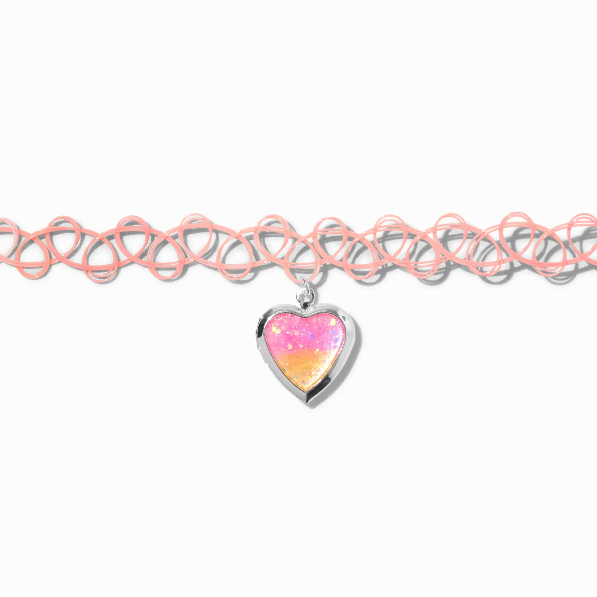 Glow-in-the-dark details and glitter join forces on this tattoo choker necklace. The impactful pink choker has a silver-tone heart locket pendant that opens to keep a small picture or note. Plus, the glittery pendant also glows in the dark when exposed to light first for best results.