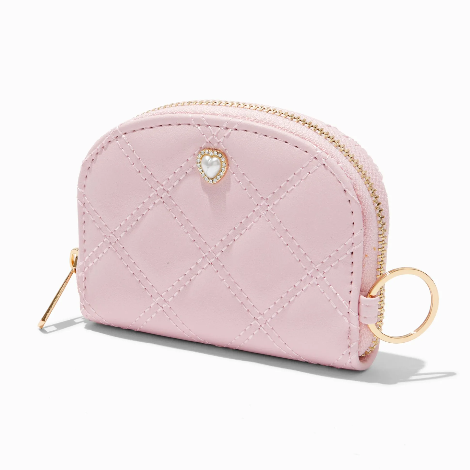 In the fashion world, this half-dome wallet is known as a “taco” design! This one is made of soft faux leather and features classic quilted styling, plus a dainty heart. Unzip to find several sections for your cards and cash. There’s also a ring for your keys!