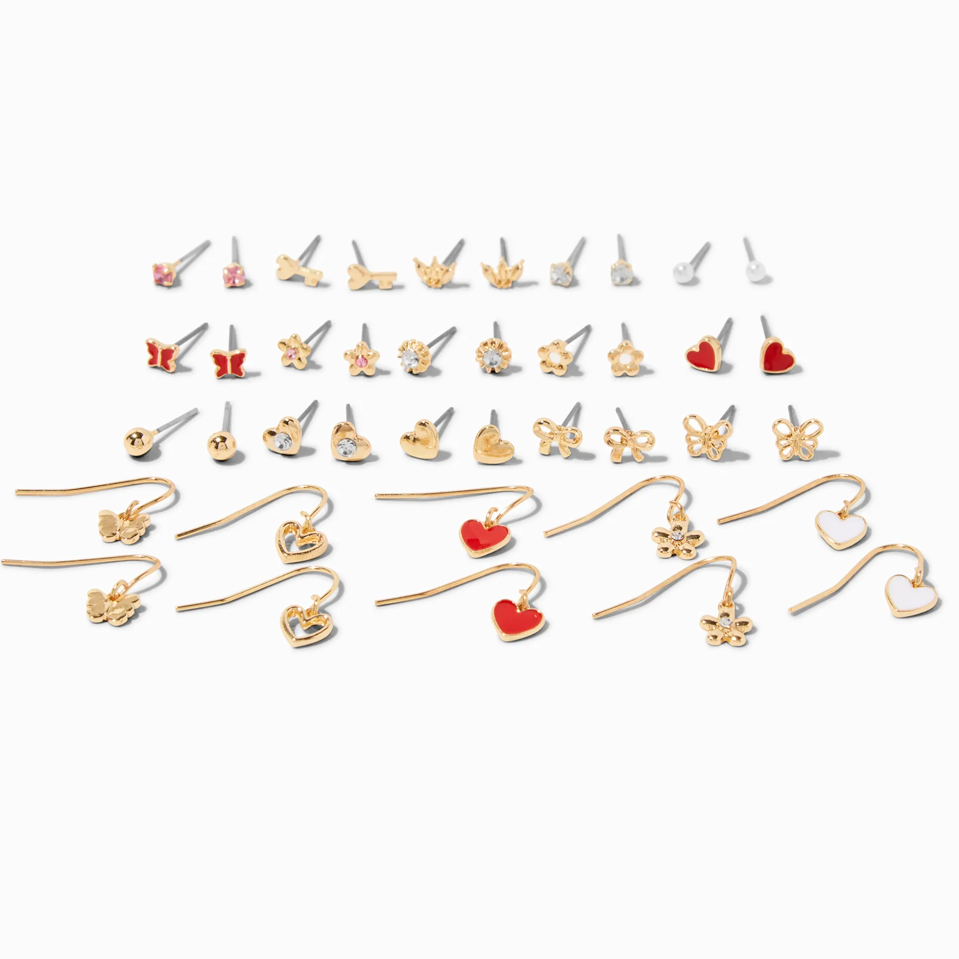 Hearts, butterflies, flowers, and more! You’ll love how all the dainty earrings in this set coordinate with each other, whether you feel like mixing, matching, or stacking! The set includes a mix of studs and wires, some with colorful enamel accents.