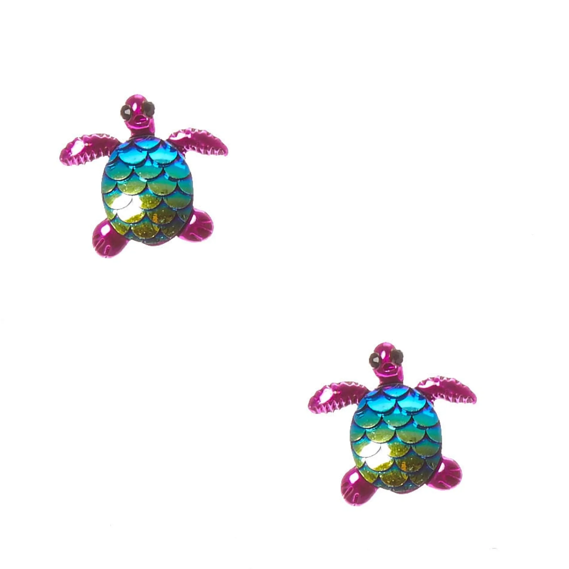 Keep swimming through life with these guys by your side! Adorable pink turtle has black gem eyes with an ombre holographic blue scale shell.