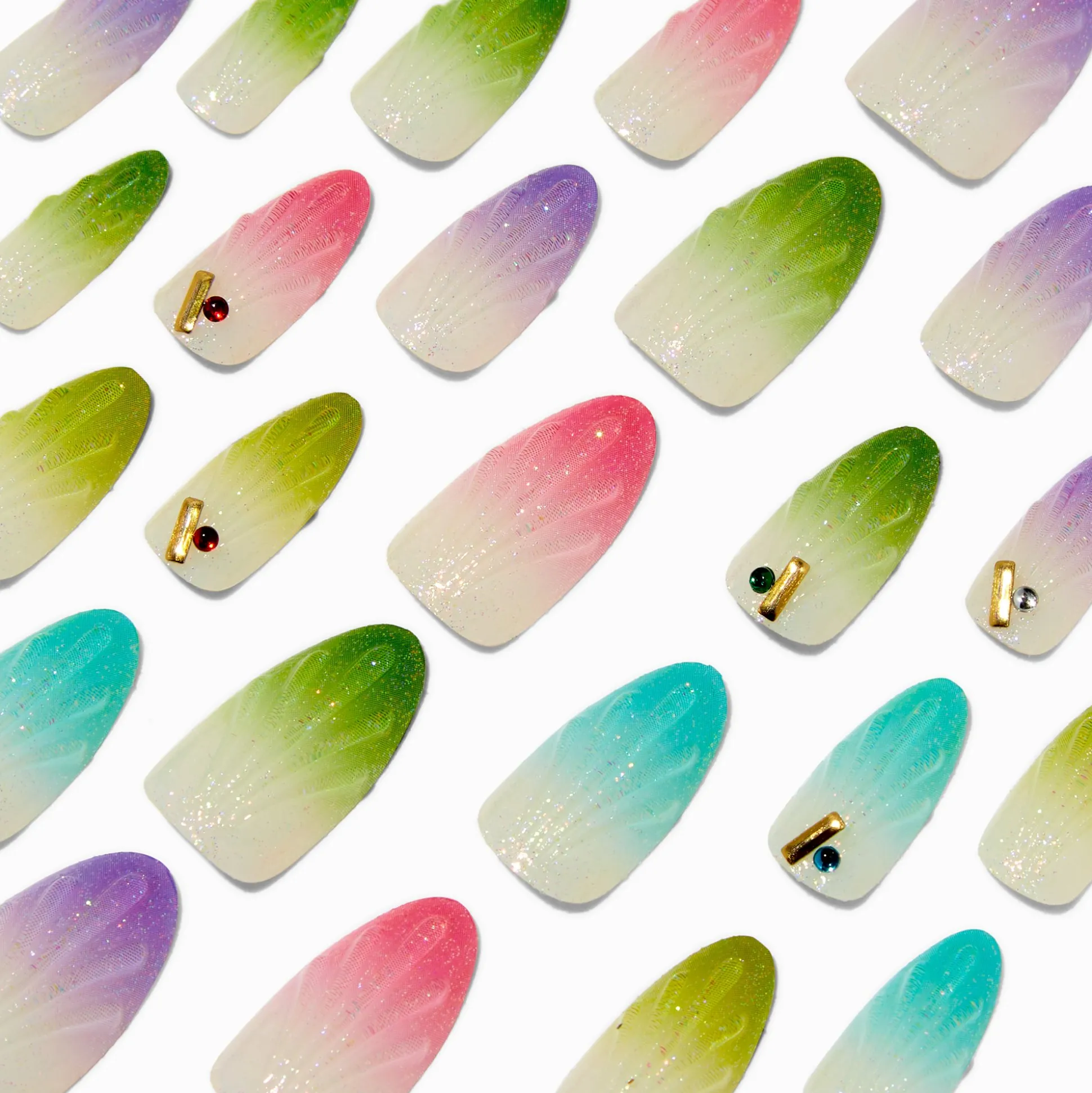 With an improved fit and up to a 7-day wear, these squareletto vegan faux nails are on-trend faves. They come in 12 different sizes, so finding the perfect shaped nail is a breeze. With an almond shape, these faux nails have a holographic seashell design.