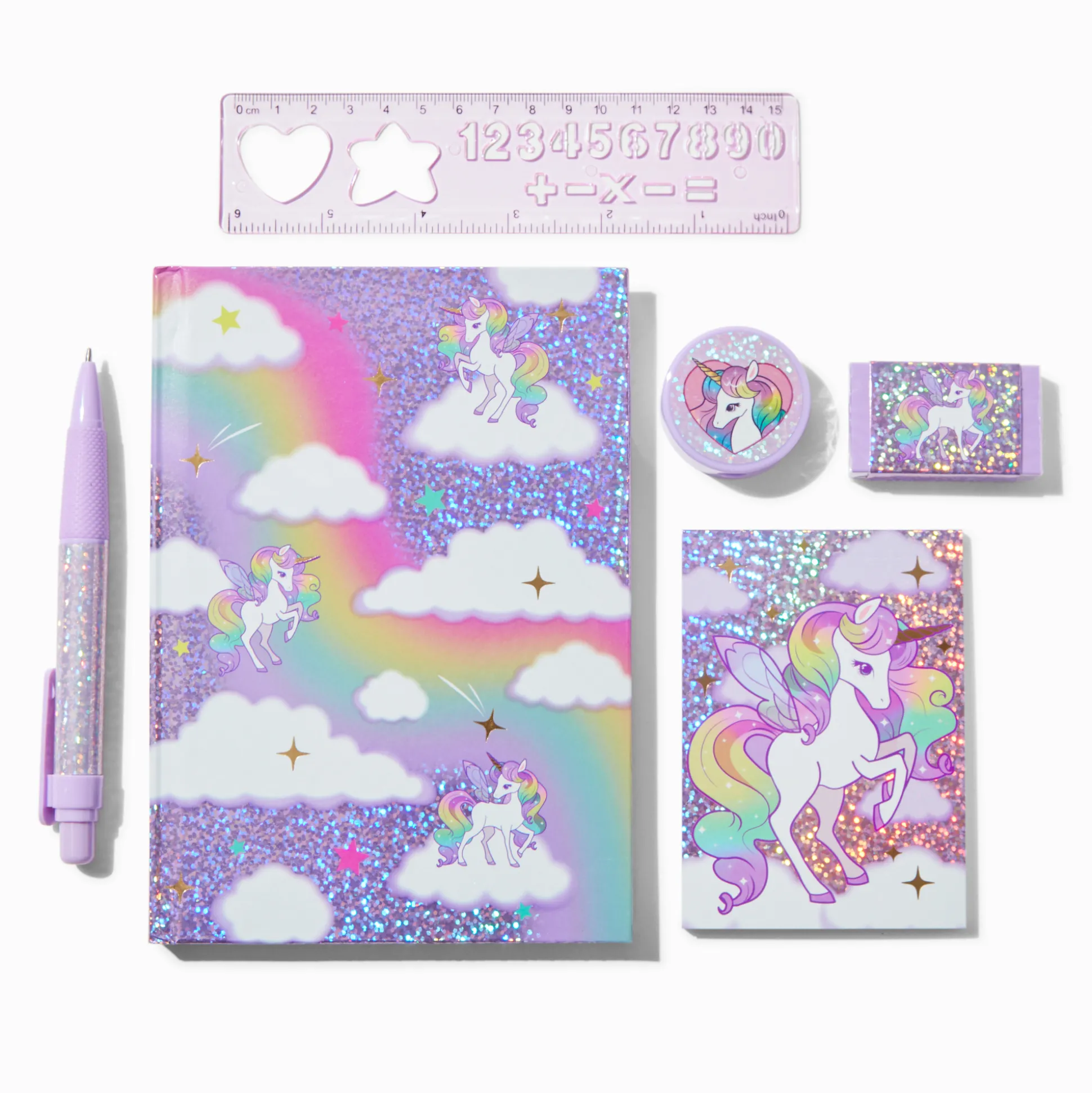 Decorated all over with a holographic unicorn design, this stationery set has everything you need for school and home! You get a pen, eraser, ruler, pencil sharpener, notebook, and mini notepad for doing homework, making lists, drawing pictures, and recording all your thoughts.
