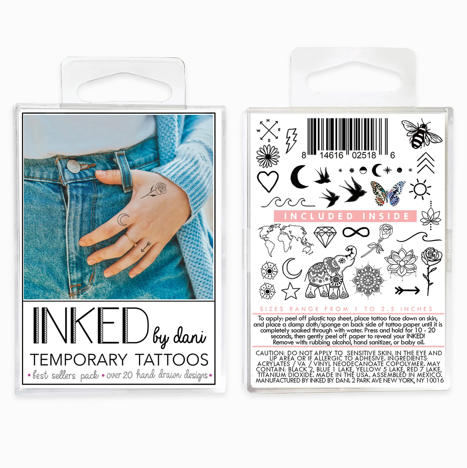 How To: Ensure the skin is completely dry and free of oils or lotions before application for best results. Cut out your fave INKED design. Peel off the plastic top sheet, place and press the tattoo face down, and wet the tattoo paper with water until it is completely soaked through. Press and hold down in place for a few seconds, then gently peel up paper to reveal your INKED!