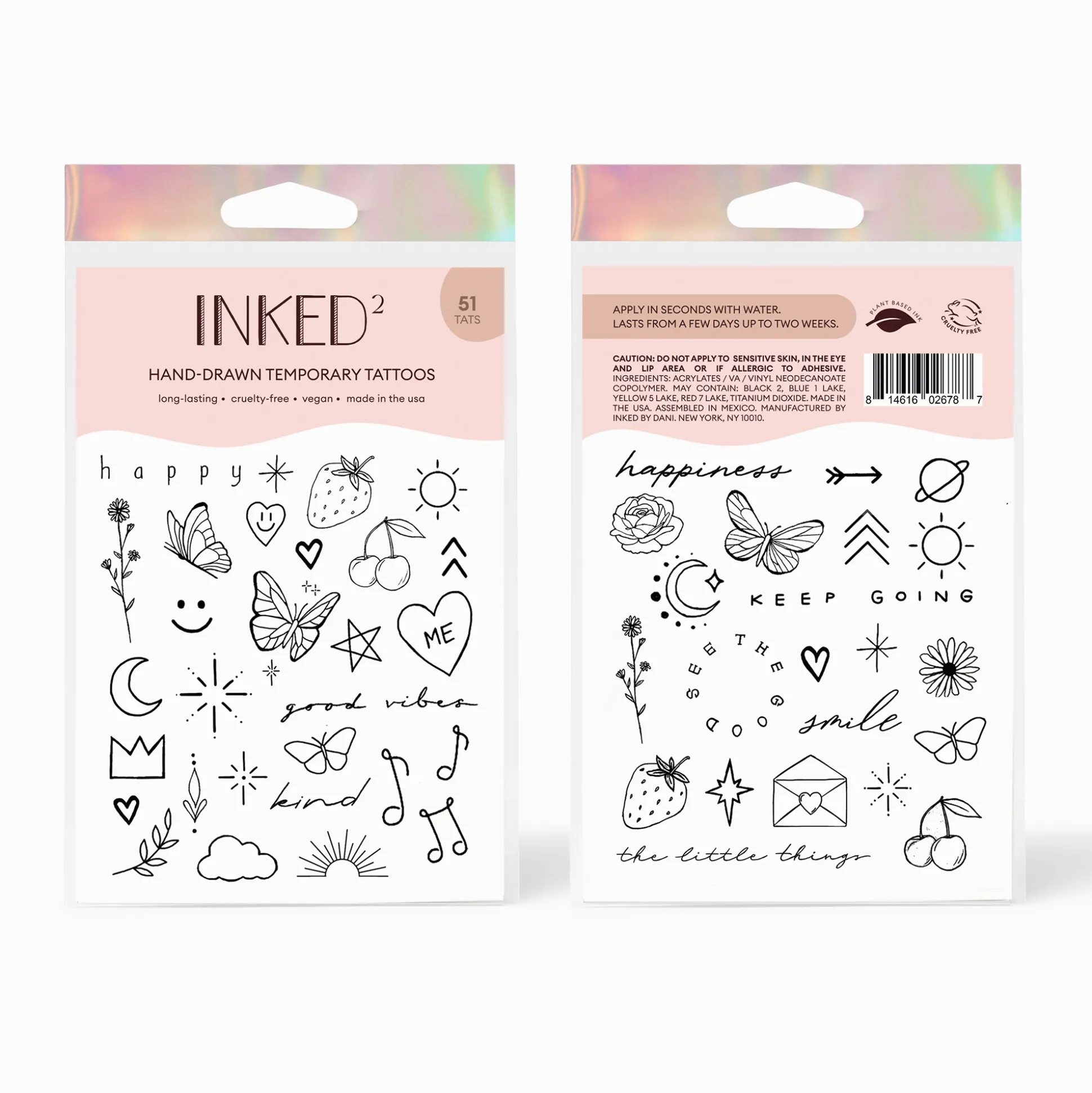 How To: Cut out your fave INKED design. Peel off the plastic top sheet, place and press the tattoo face down, and wet the tattoo paper with water until it is completely soaked through. Press and hold down in place for a few seconds, then gently peel up paper to reveal your INKED!