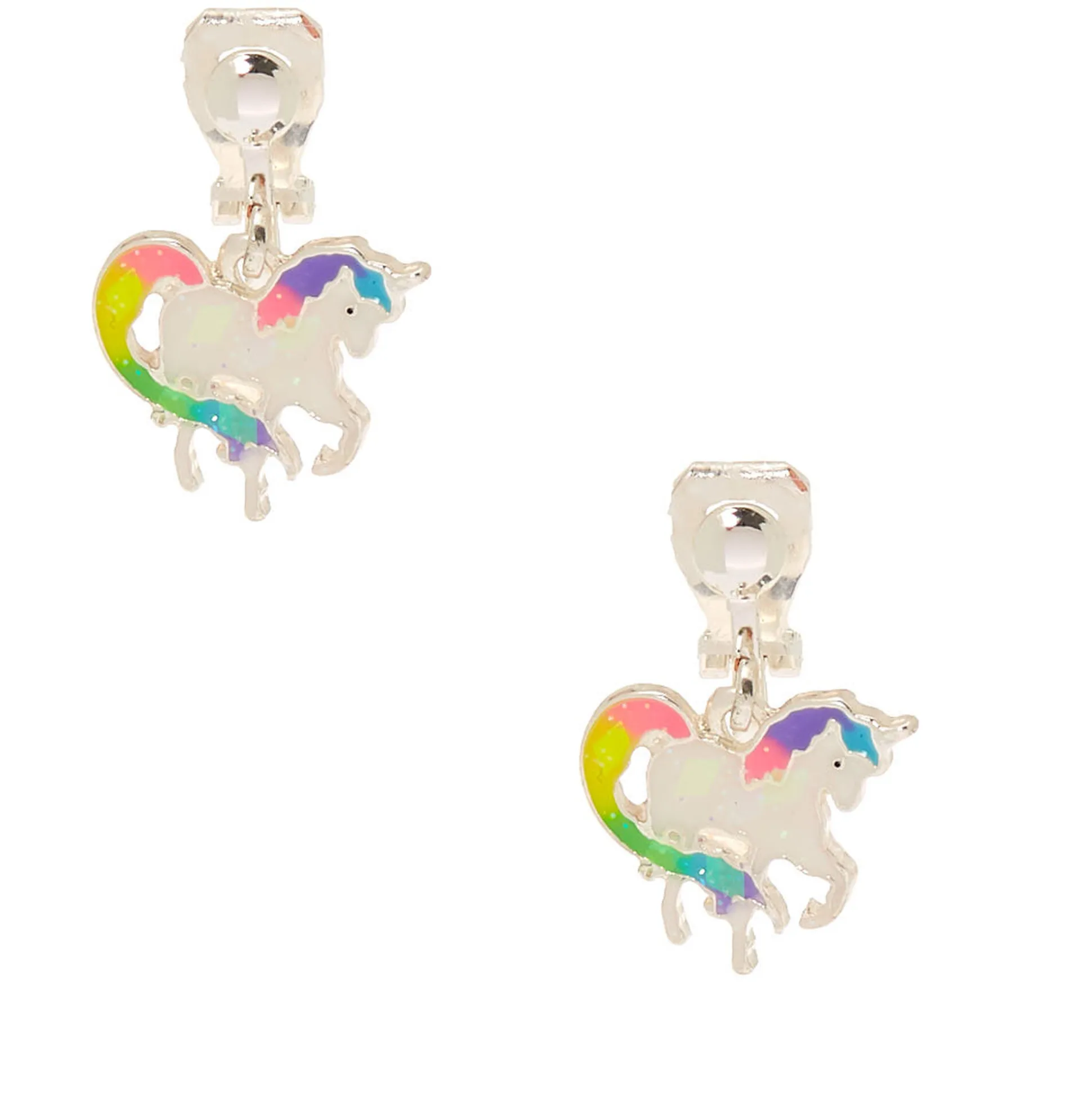 Shimmer like magic with this pair of unicorn clip-on earrings! These earrings features a rainbow unicorn with iridescent colours that shine brightly.