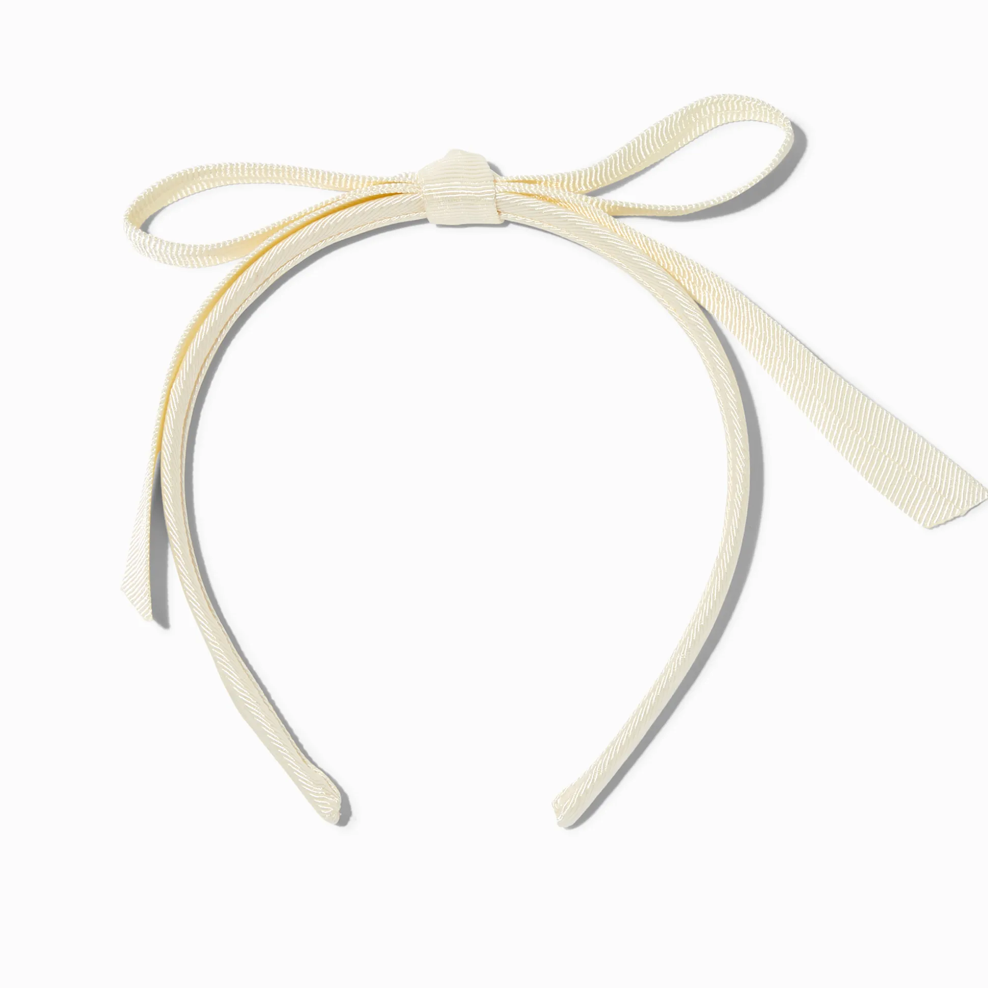 Keep your look on fleek and your hair out of your face with this skinny headband. It’s covered in ivory grosgrain ribbon that forms a bow for the perfect finishing touch.