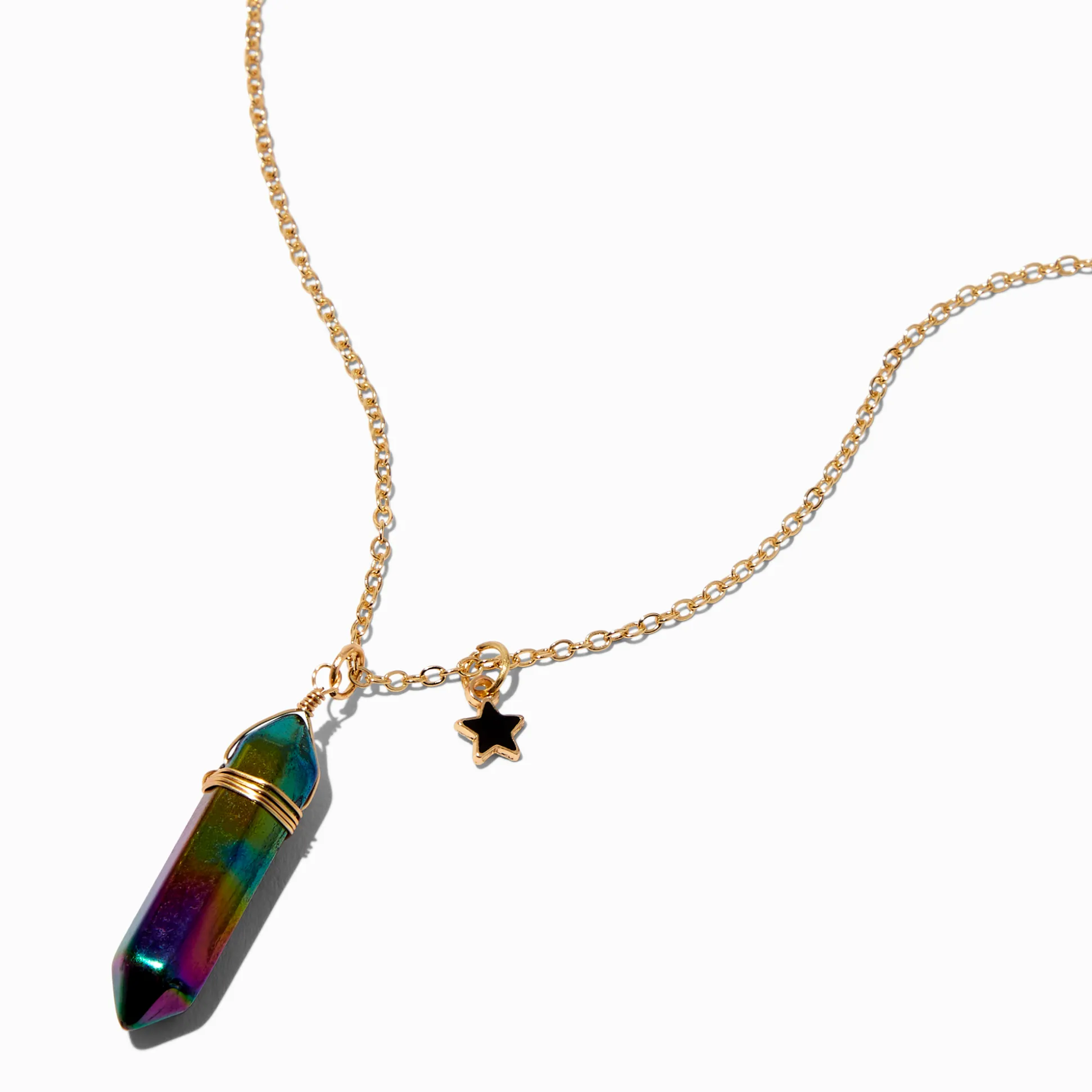 This gold-tone necklace gives off a colorful, ethereal vibe that you are sure to love. The necklace has a faux mystical gem pendant in a rainbow of beautiful jewel tones plus a small black star dangle for a celestial touch.