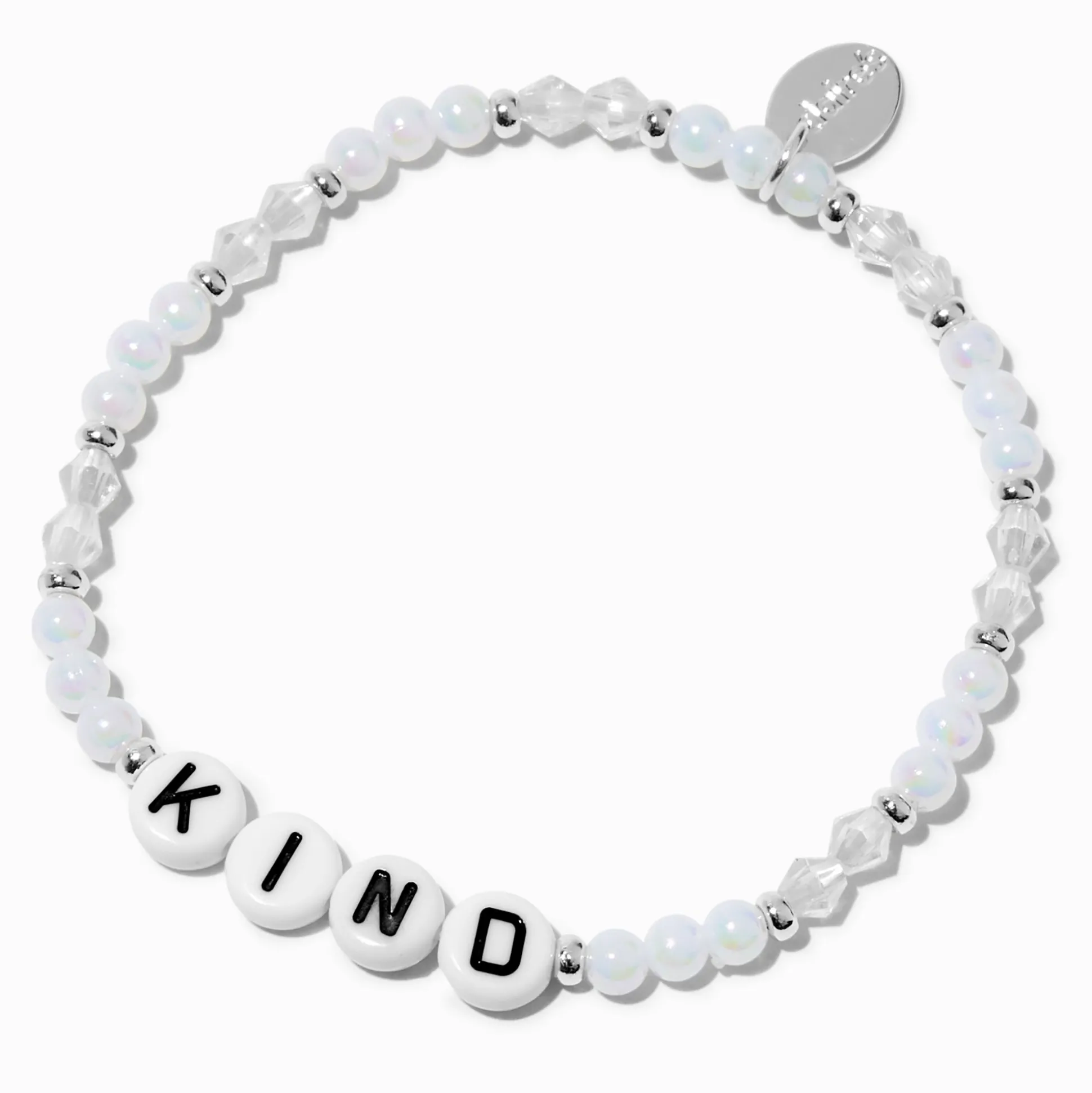 Be kind in this silver-tone bracelet. The stretch bracelet has white beads, and “Kind” in alphabet beads.