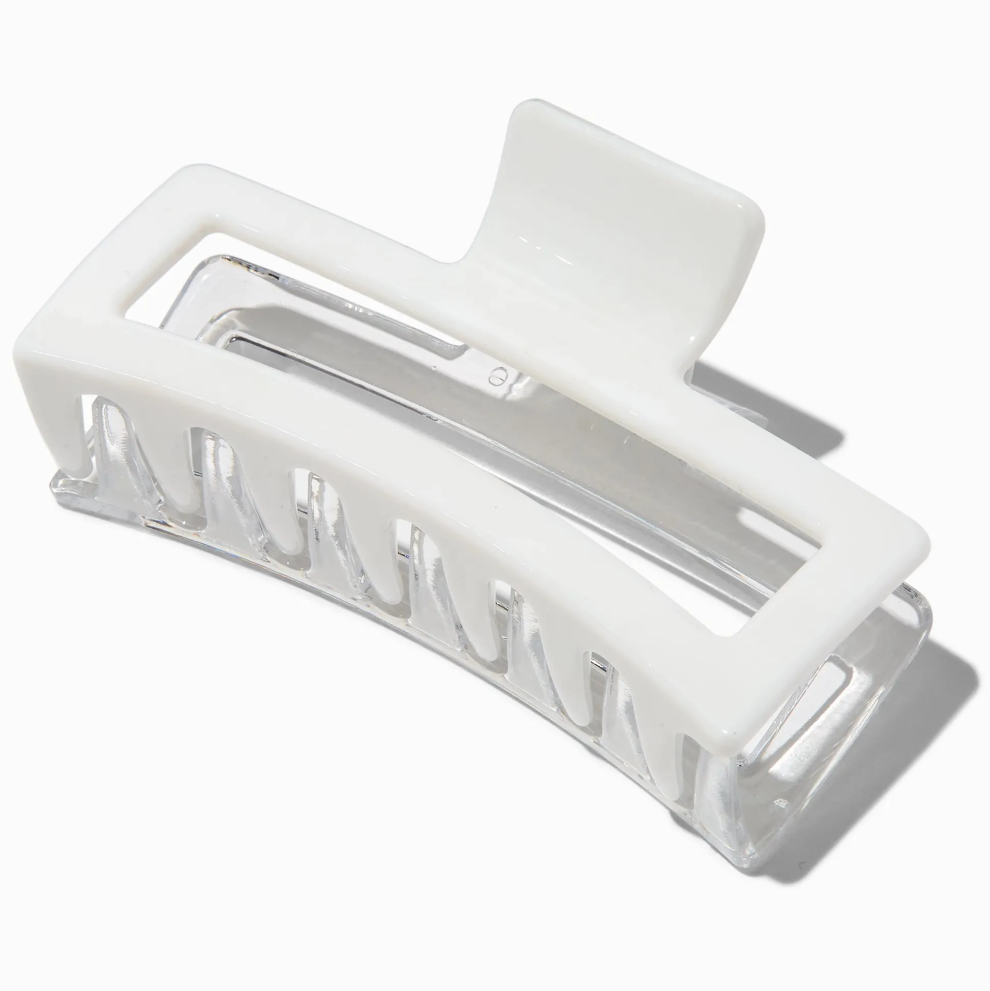 This large rectangular hair claw has a two-tone design with a clear side and an opaque side. Grippy teeth in a rectangular design create maximum style with minimal effort.