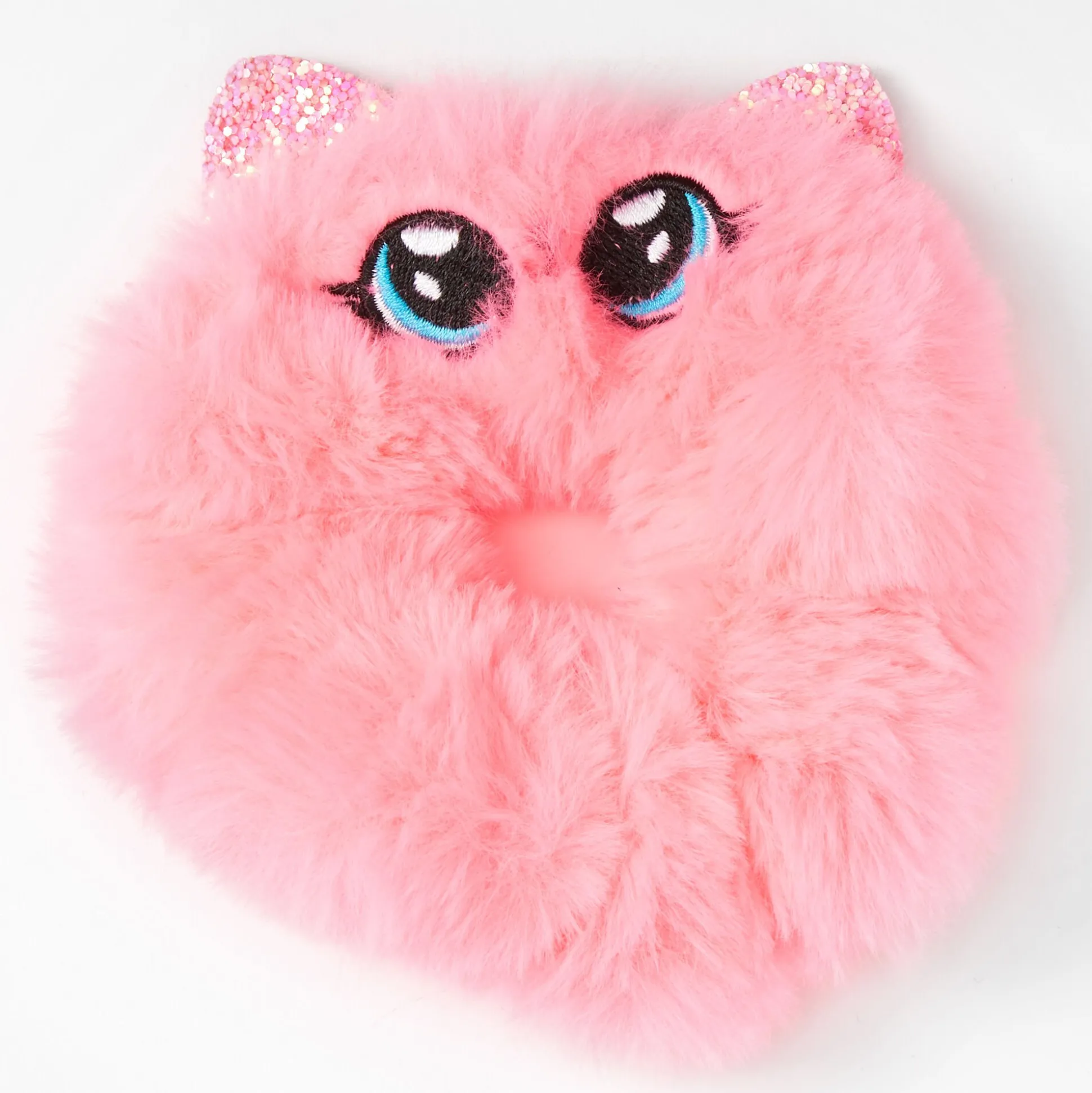If you love cats, then this hair scrunchie is purr-fect for you! This faux fur pink hair scrunchie features an adorable cat design with sparkly glitter ears.