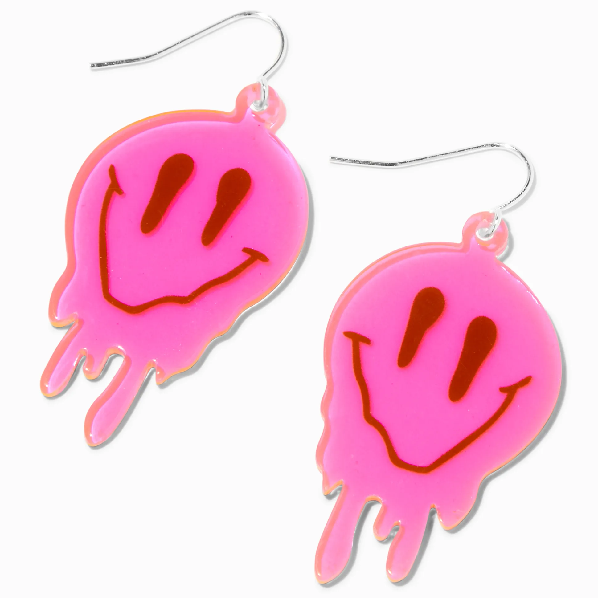 “Melt” into your happy place when wearing these drop earrings. These pink happy face earrings are made of durable acrylic.