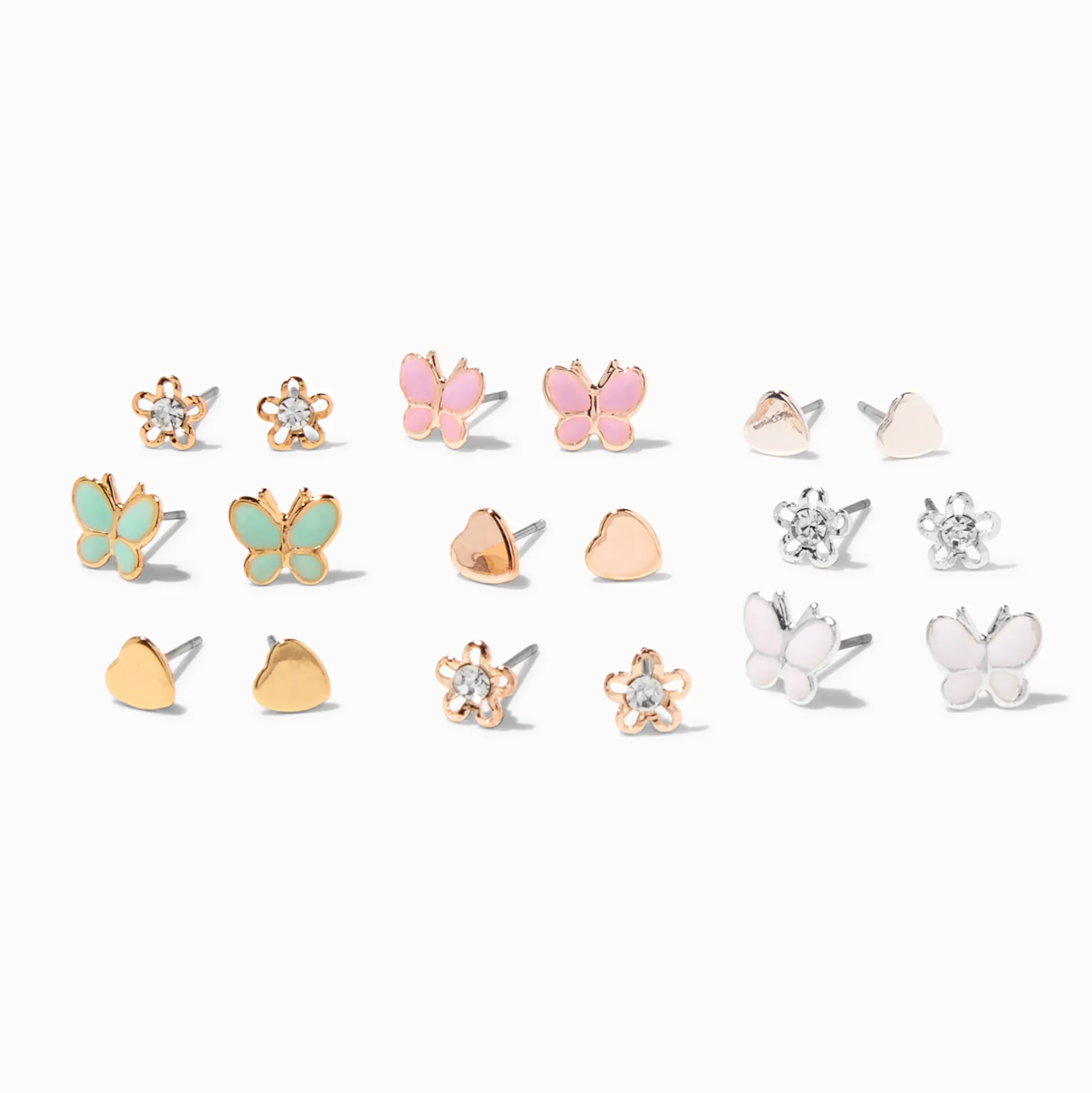 Spring towards warm weather vibes with this expansive set. The mixed metal studs include faux crystal daisies, butterflies, hearts, and more.