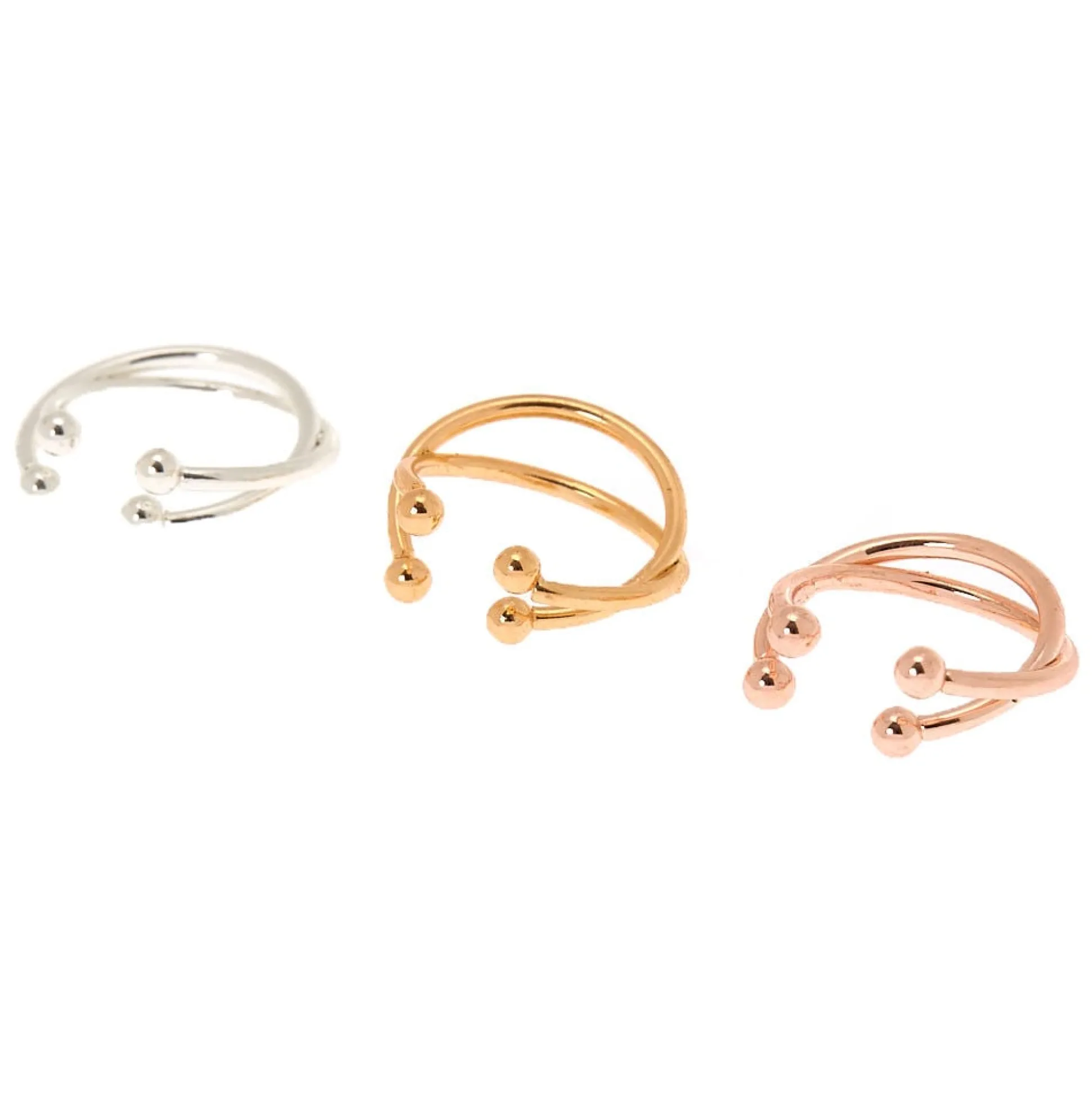 Add some bling to your cartilage and pair these ear cuffs with all your favorite jewelry pieces! This pack includes 3 criss cross design ear cuffs in silver-tone, gold-tone, and rose gold-tone.