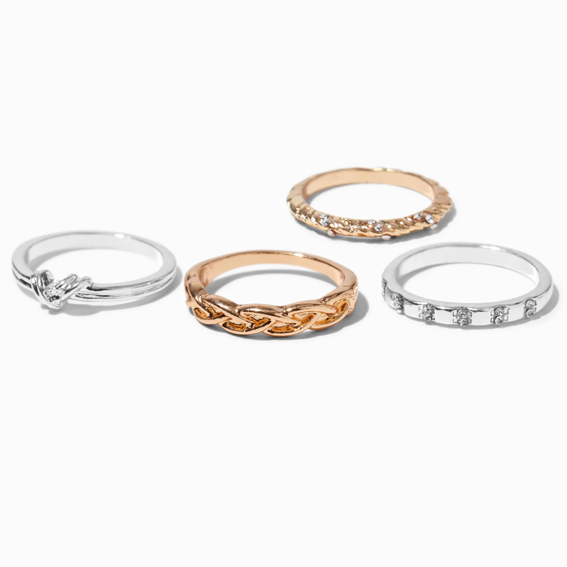 Create a mixed metal ringscape with this four-pack set. It includes two gold-tone rings and two silver-tone rings with braided, knotted, and faux crystal details.