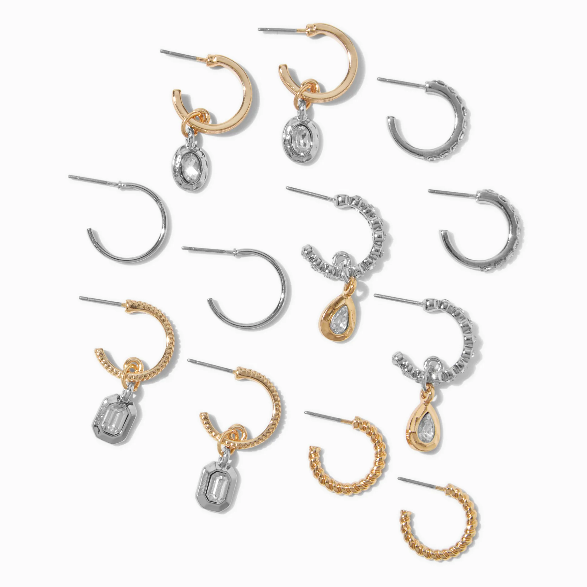 Always have the perfect hoops with this six-pair set. The mixed metal set has textured details that are finished with dangling faux crystals.