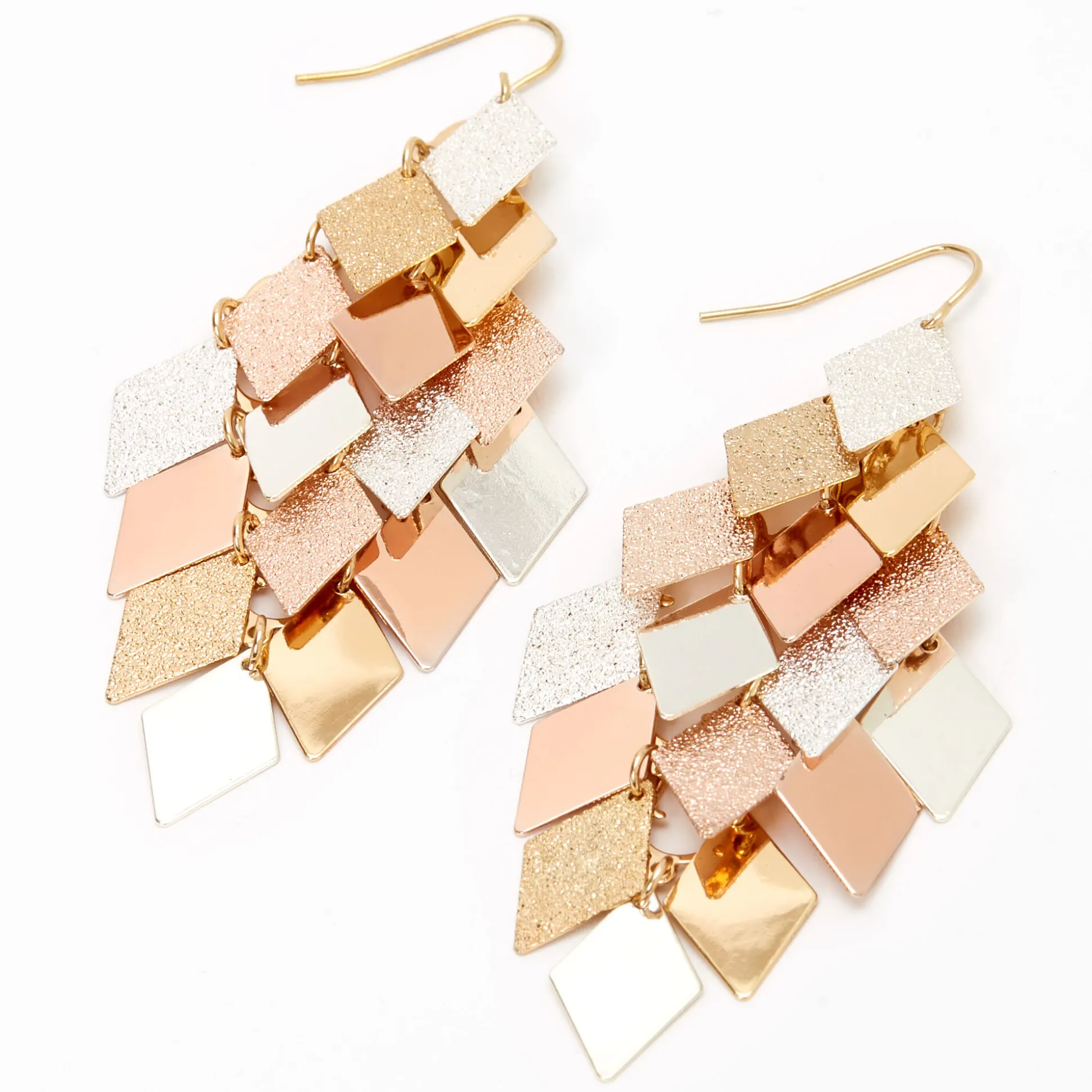 These glamorous diamond chandelier drop earrings are a must-have jewelry accessory! The pair of earrings feature silver, gold, and rose gold-tone diamond pieces in a chandelier design.