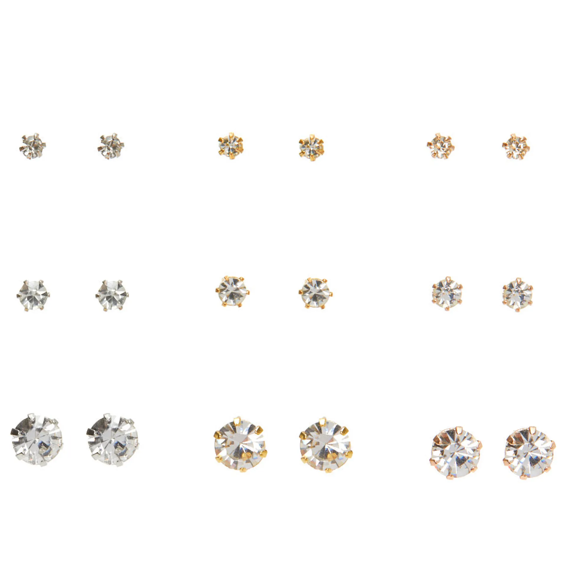 Add a little sparkle or a lot to your ears with this set of earrings. The set includes 3 sizes of crystal studs in silver-tone, gold-tone, and rose gold-tone.