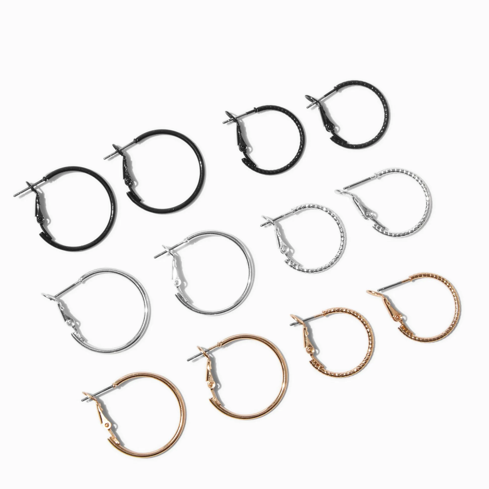 Always have the perfect pair of hoops with this six pack set. It includes black, silver- and gold-tone.