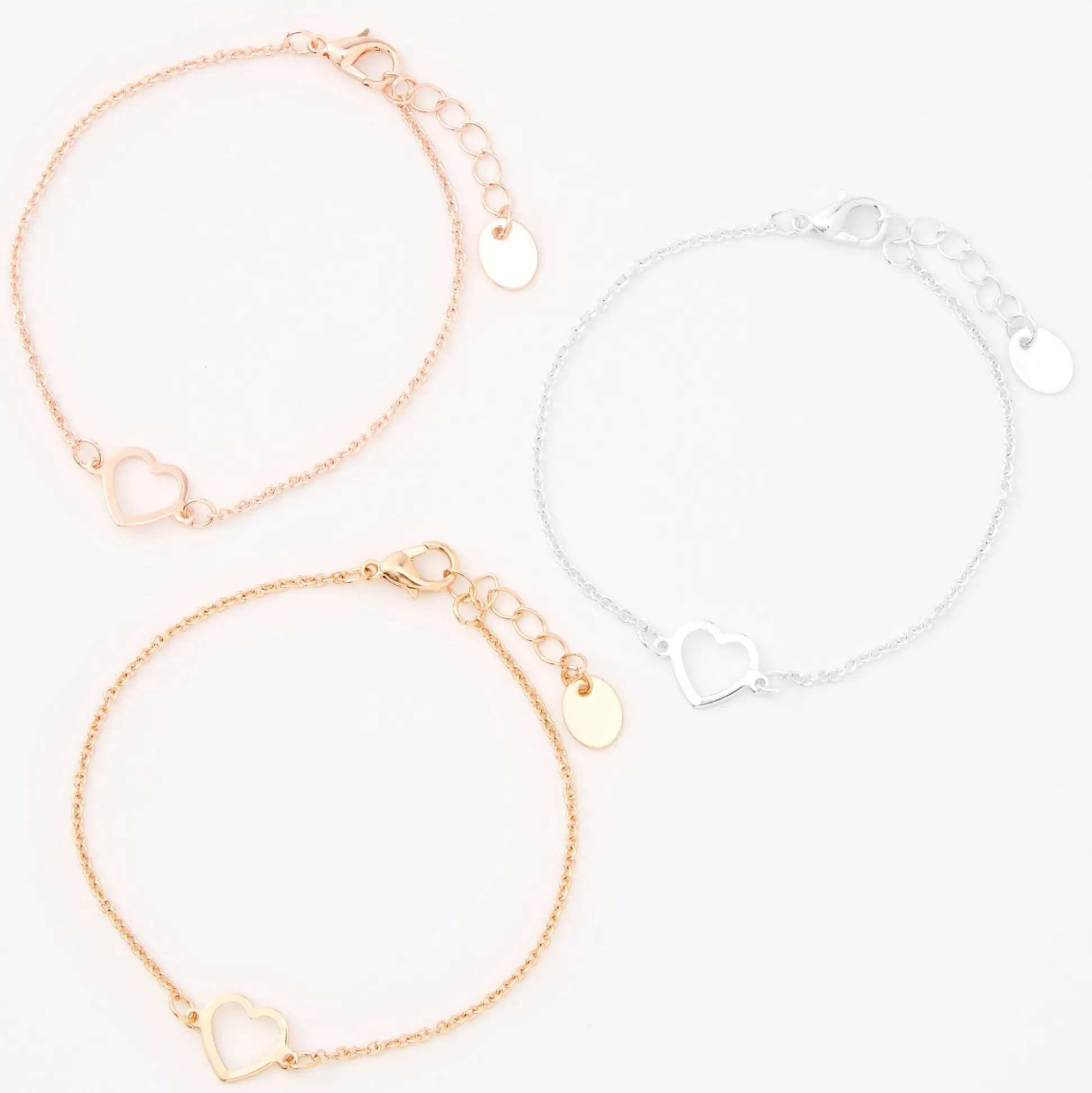 Fall in love with this heart bracelet set! It includes three bracelets in three finishes: silver-tone, rose gold-tone, and gold-tone.