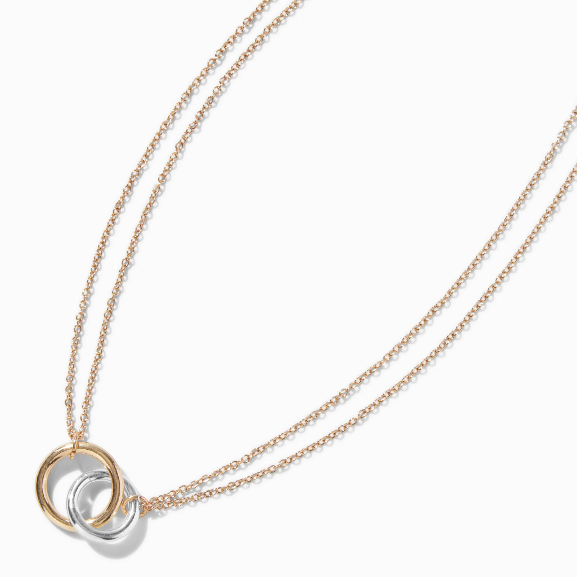 Embrace both silver and gold with this mixed metal multi-strand necklace. It has two interlocking hoops, adding geometric flair.