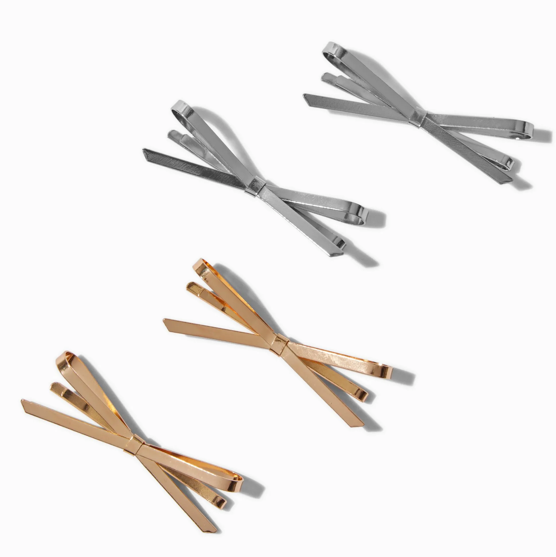 Decorate your hair with metal hair bows with this hair pin set. The four-pack includes two silver-tone pins and two gold-tone pins.