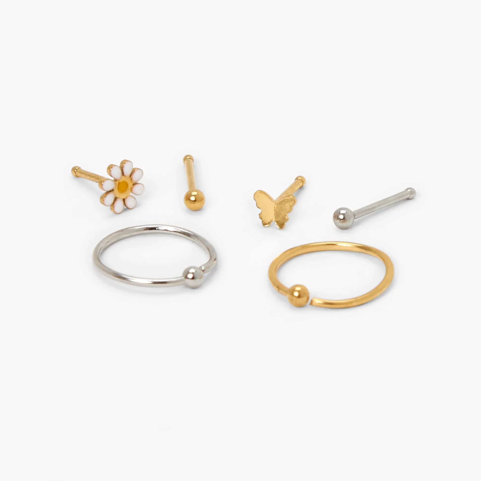 Give your nose jewelry a pop of girly touch with this must-have set! Gold and silver-tone set includes a mix of 4 different nose studs and 2 hoop nose rings in durable stainless steel. Perfect for the girl who loves butterflies and daisies!