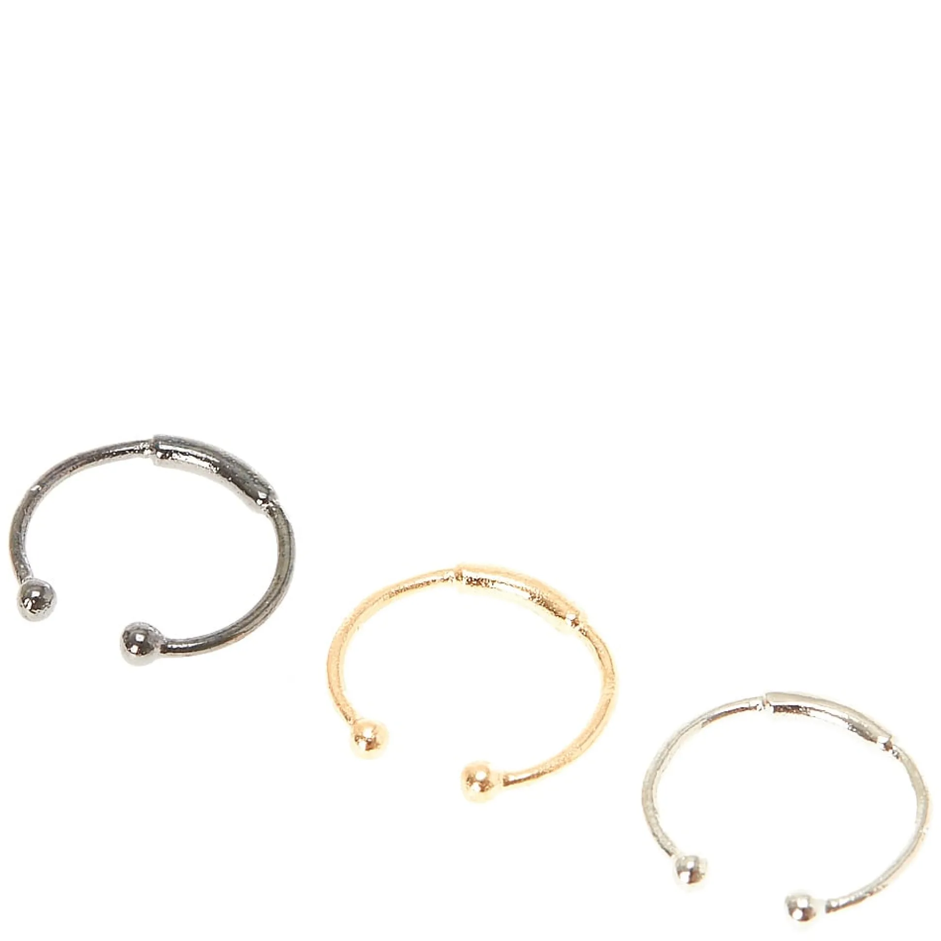 Get sleek edgy style, no piercing required with this set of faux nose rings. Small faux hoops are embellished with a bar and are capped with balls. Set includes one of each: black, gold, and silver-tone.