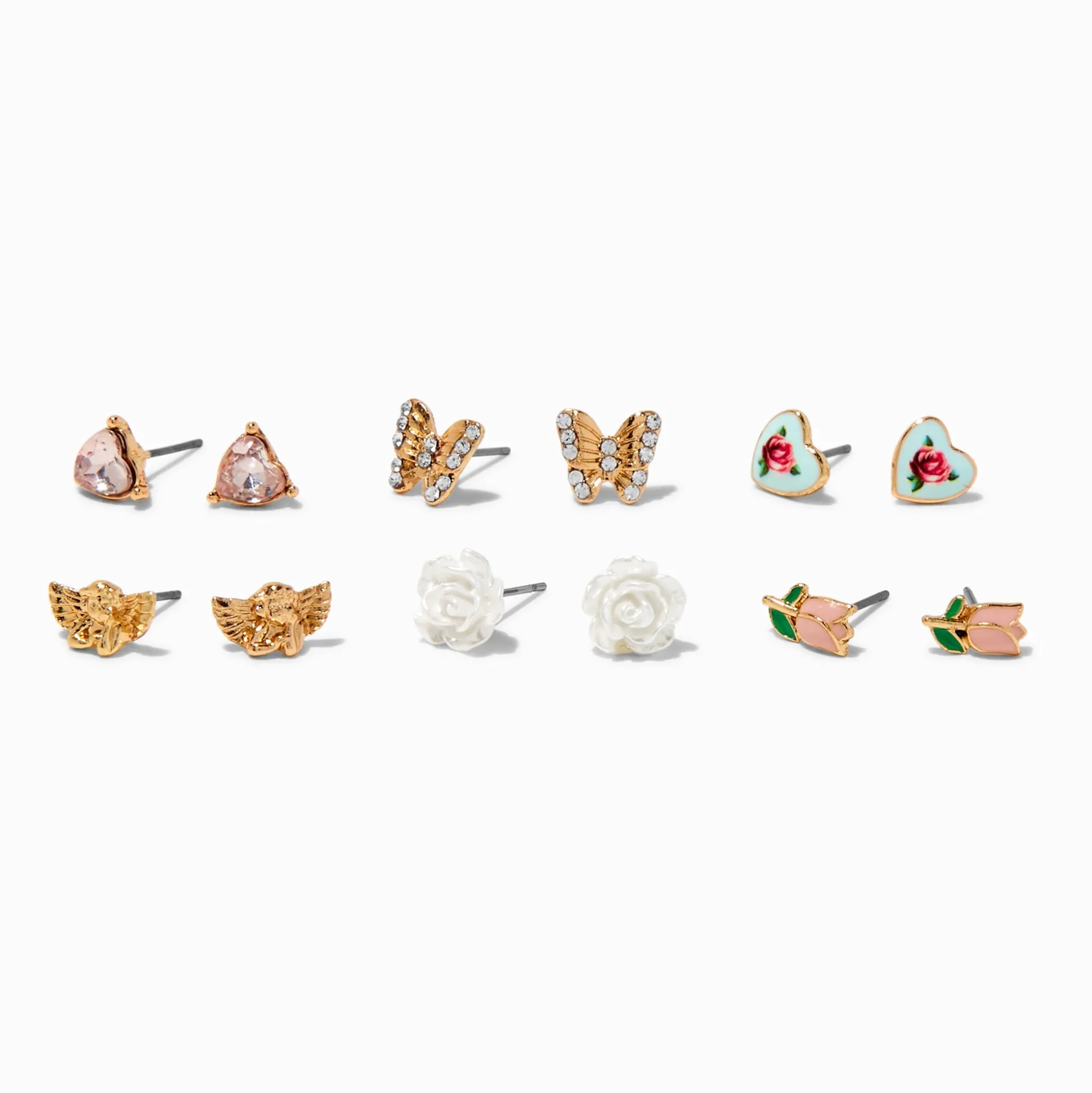 Update your spring look with the perfect pair of earrings. This six-pack includes tulips, roses, hearts, butterflies, and angels.