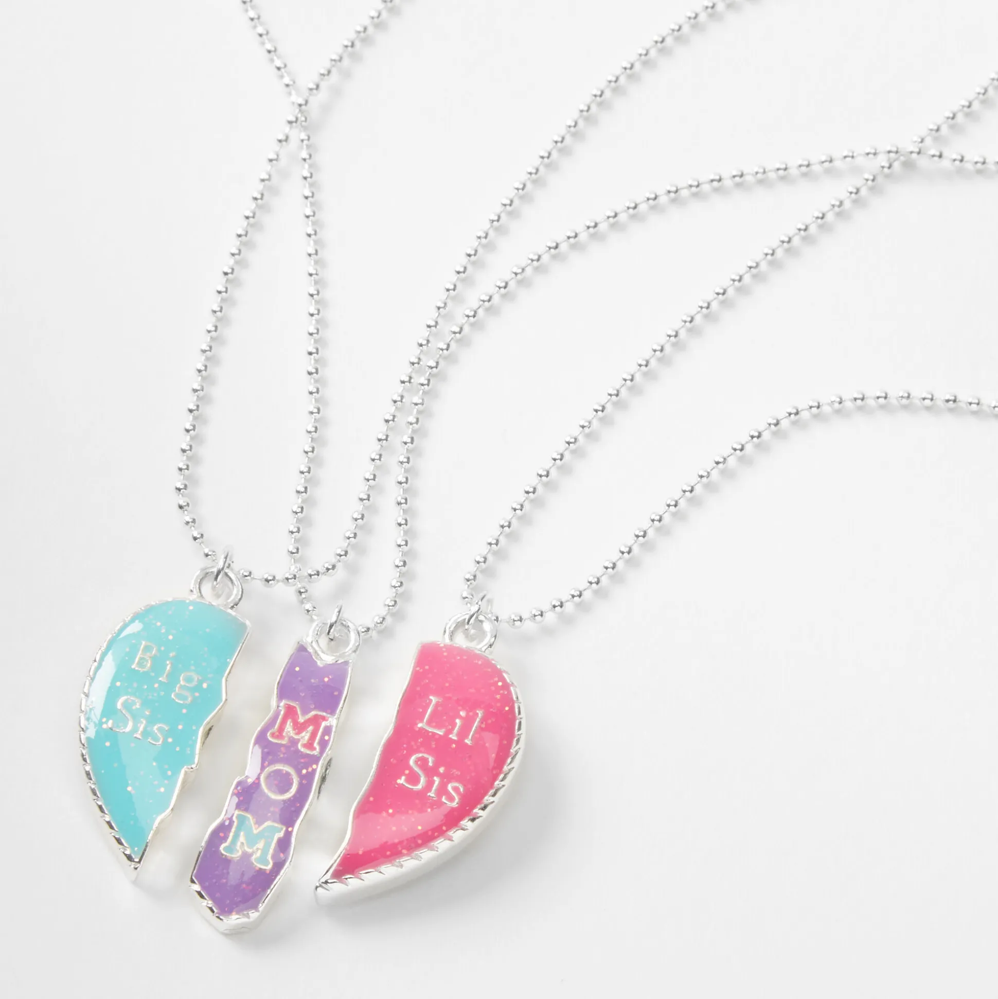 Coordinate with your mom and sister with this set of pendant necklaces! Set of three features break apart heart charms in pink, purple, and blue on silver-tone chains.