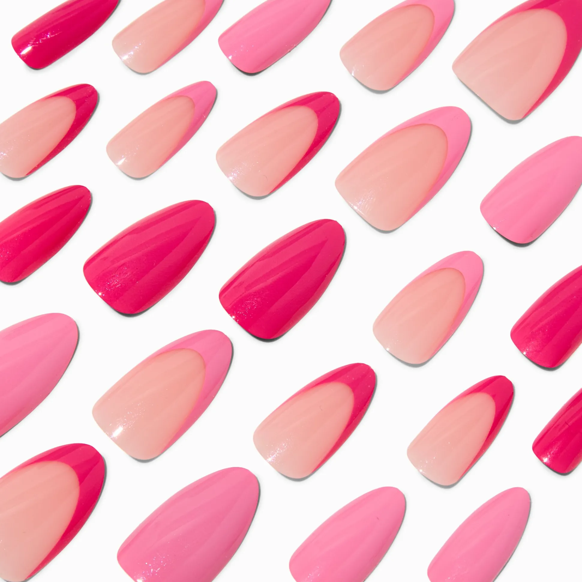 With an improved fit and up to a 7-day wear, these vegan faux nails are on-trend faves. They come in 12 different sizes, so finding the perfect shaped nail is a breeze. With a long almond shape, these faux nails have a monochrome pink finish.