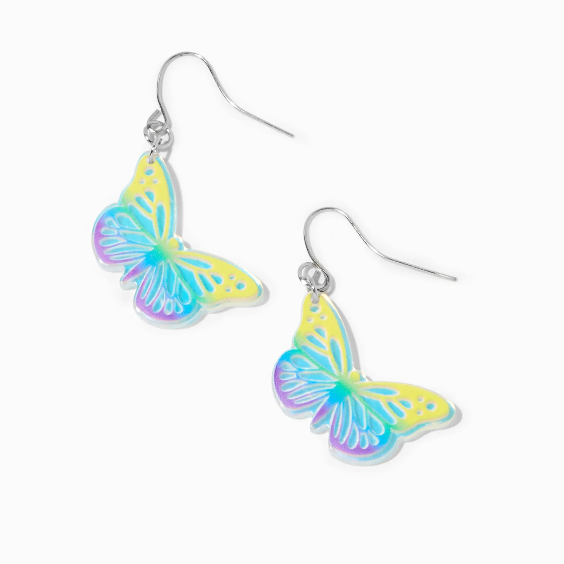 Flutter in style in these ombré butterfly earrings. The silver-tone drops have yellow, green, blue, and purple butterfly designs having from fish hook closures.