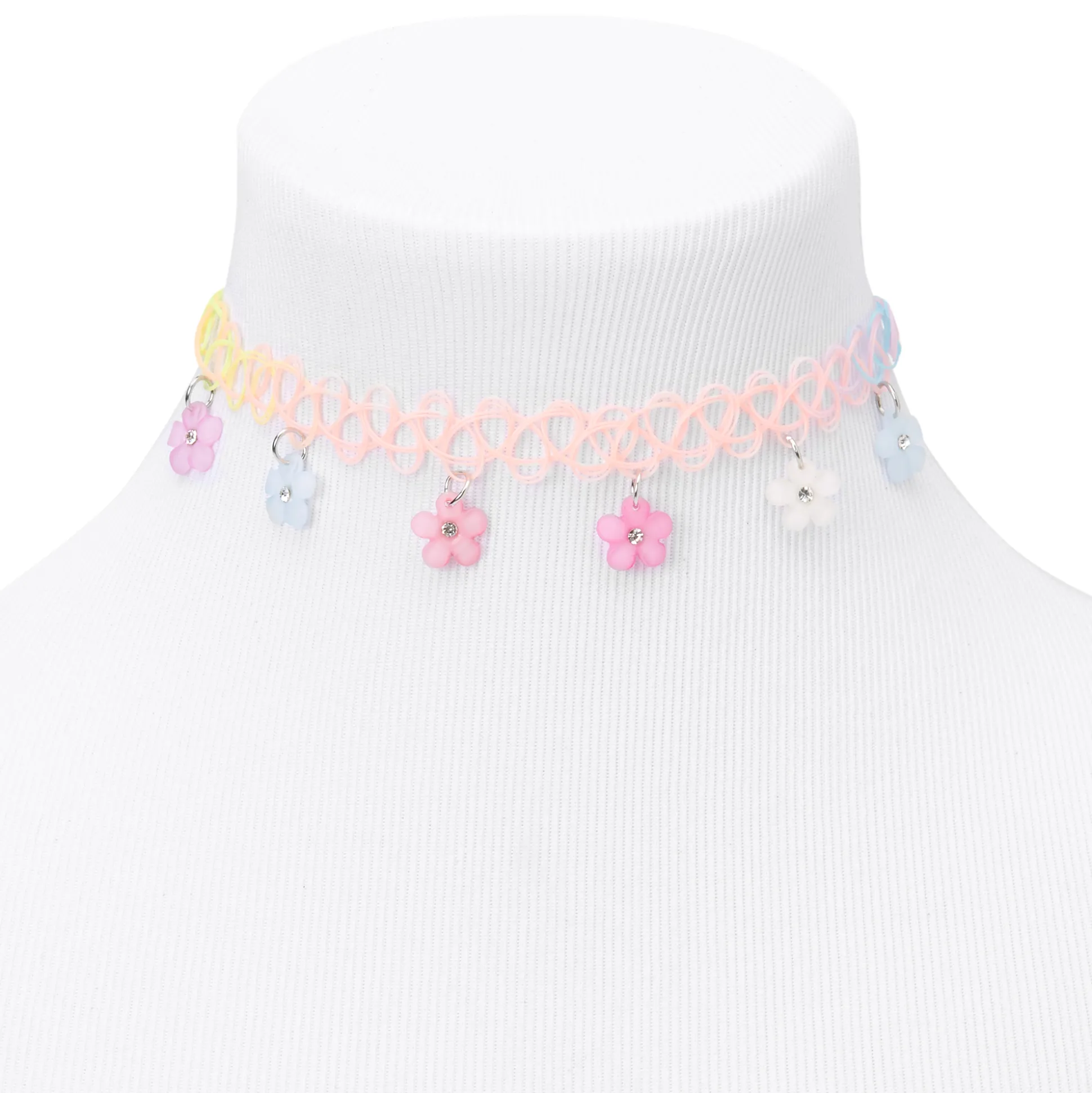 Show off a pop of flower power wearing this necklace! This tattoo choker necklace features dangly flower charms in pretty pastel colors.